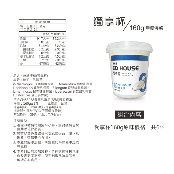 雅德屋 無糖優格【160g獨享杯】6杯組