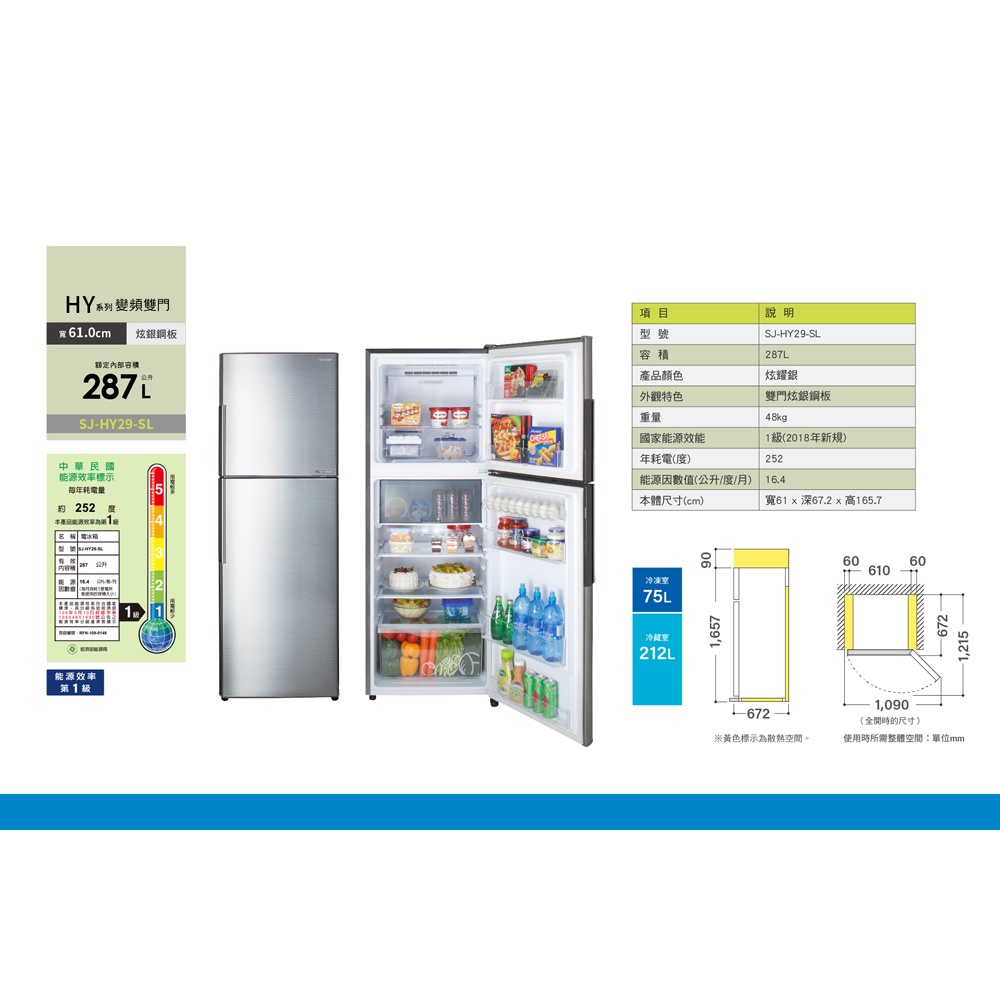 SHARP 夏普 287公升 雙門變頻冰箱 SJ-HY29-SL