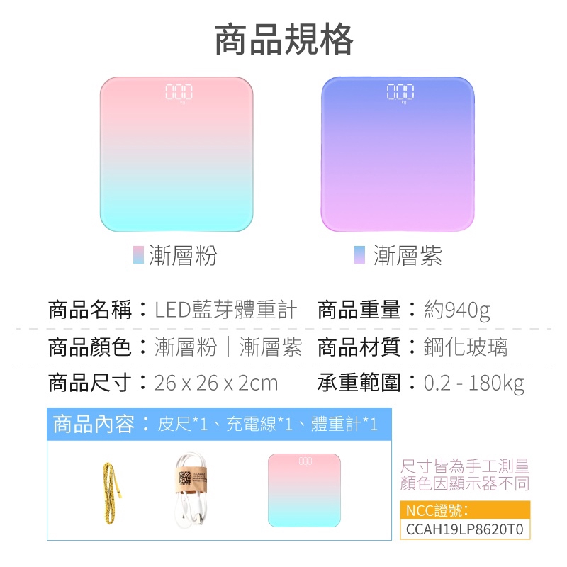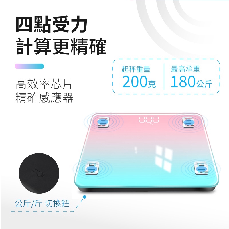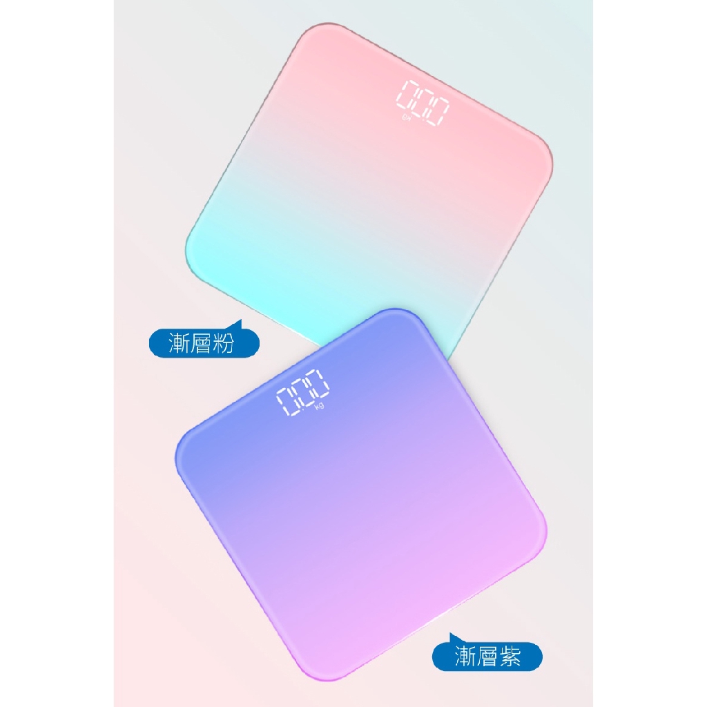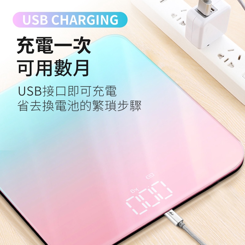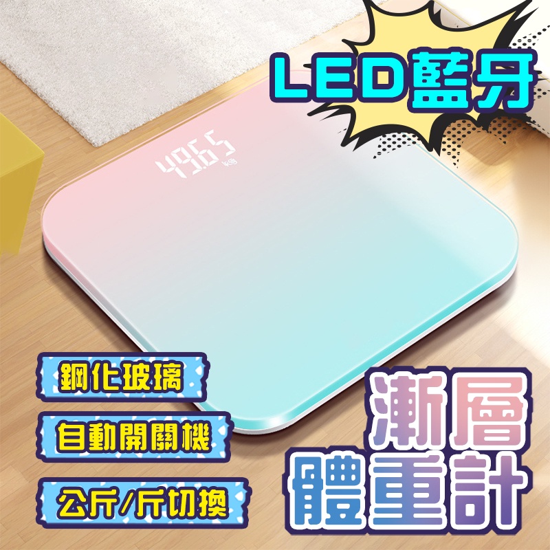 LED藍牙體重計 LED螢幕 智能漸層電子秤 USB充電 鋼化玻璃 圓角設計 防爆 可秤180公斤 馬卡龍色 體重機