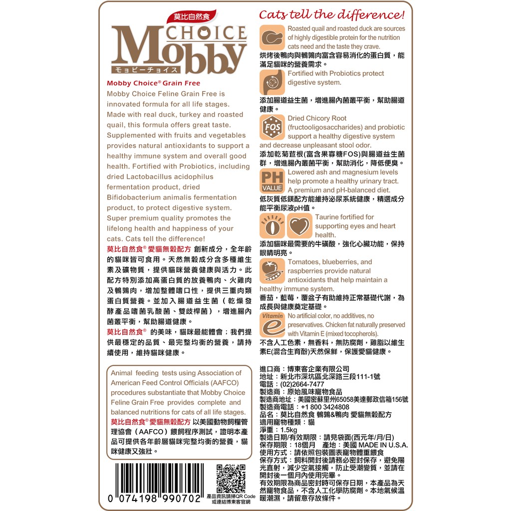 莫比 Mobby 自然食 鵪鶉&鴨肉愛貓無穀配方 1.5kg/分裝包800g 貓飼料 無穀 鵪鶉《XinWei》