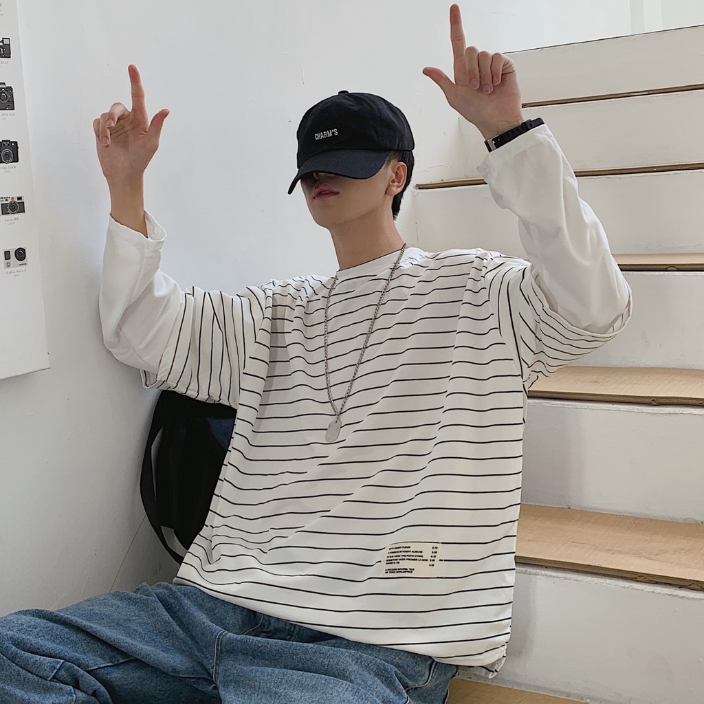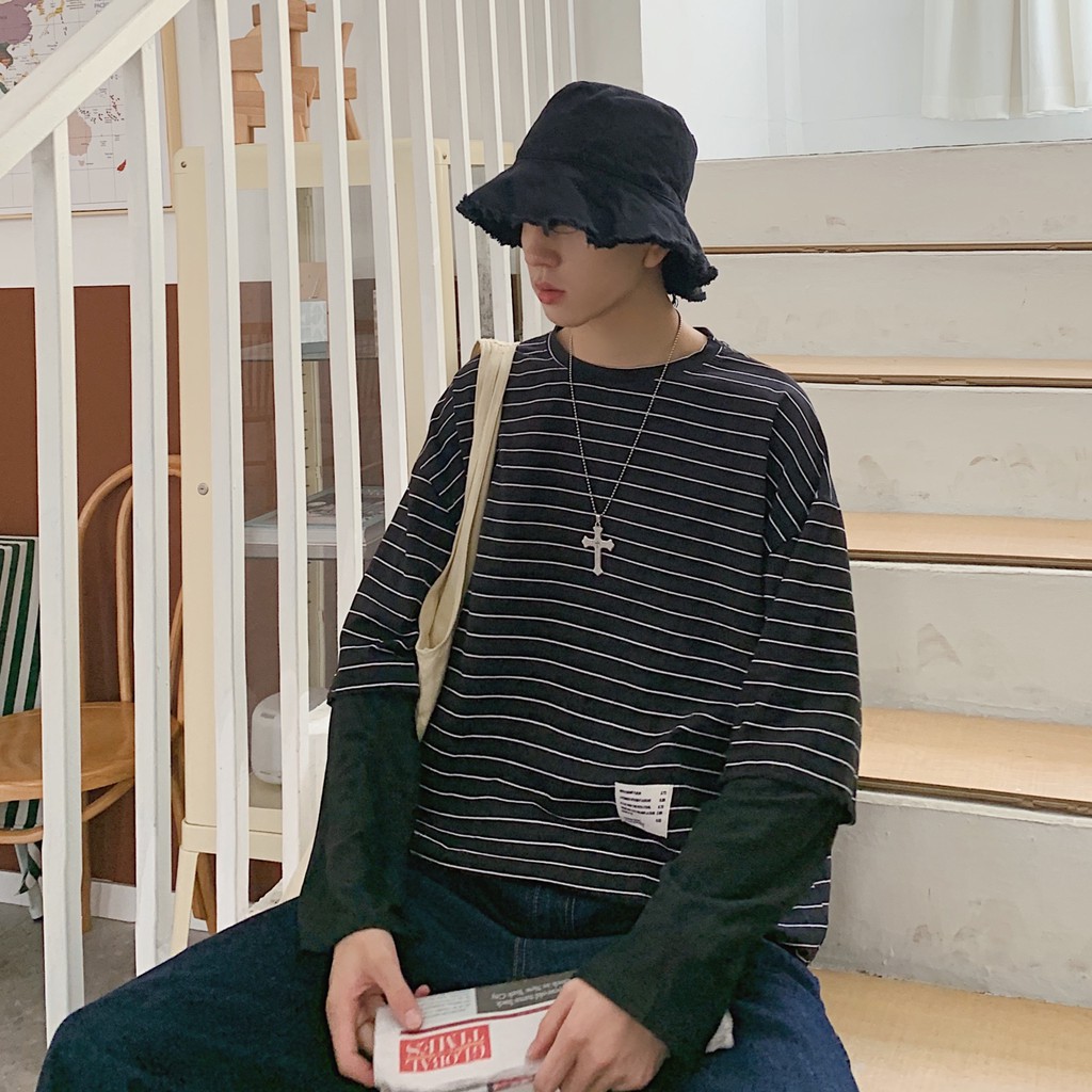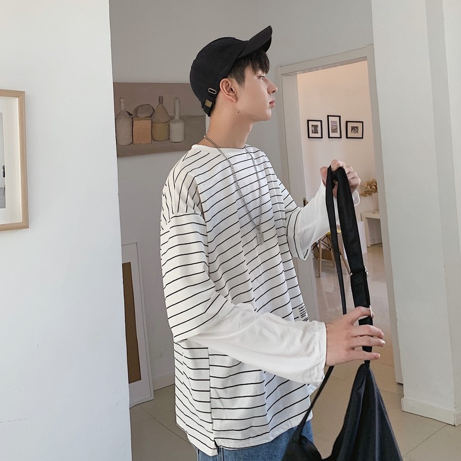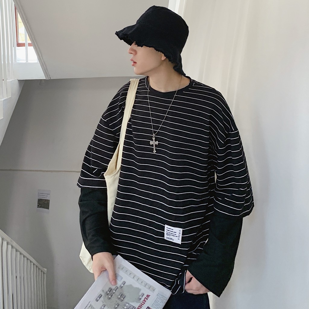 【M世代】多層次穿搭落肩T假兩件落肩長袖上衣短T 條紋寬版 拼接 穿搭必備 落肩 素T 假兩件 T恤 (CEHA56)