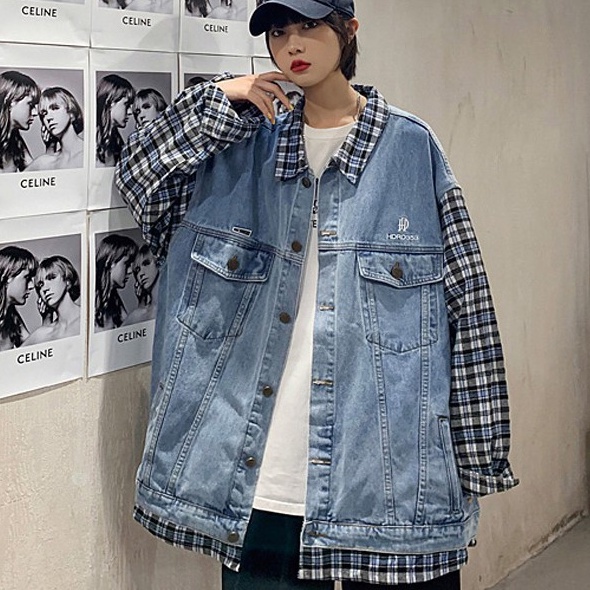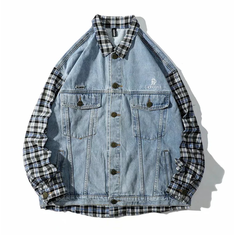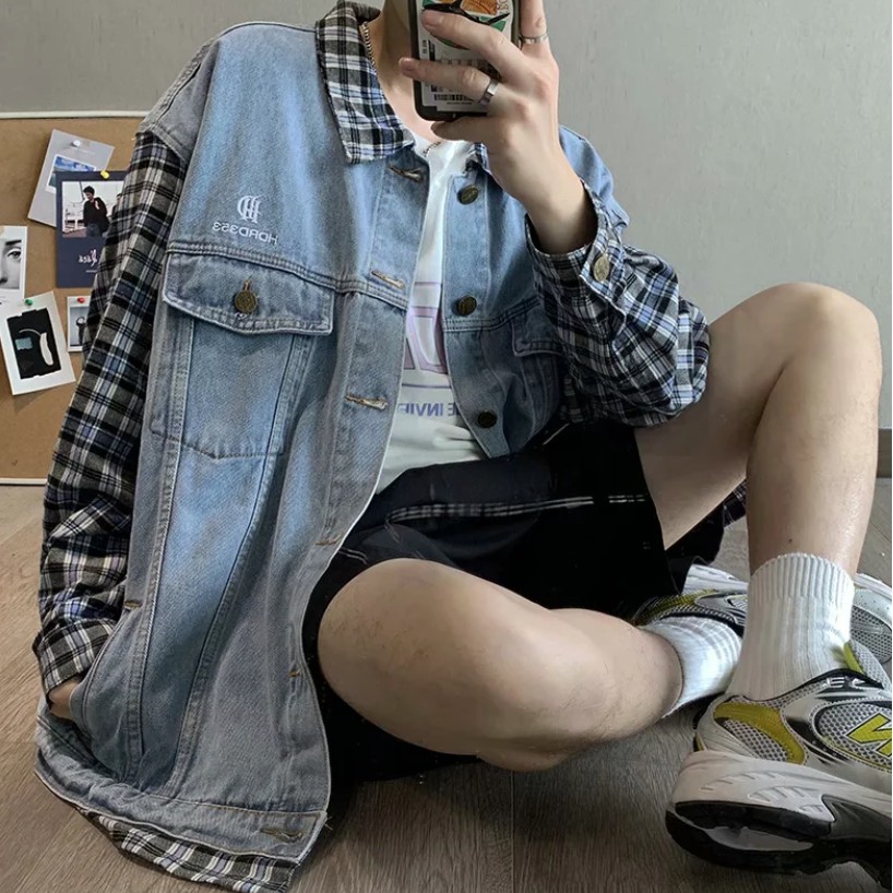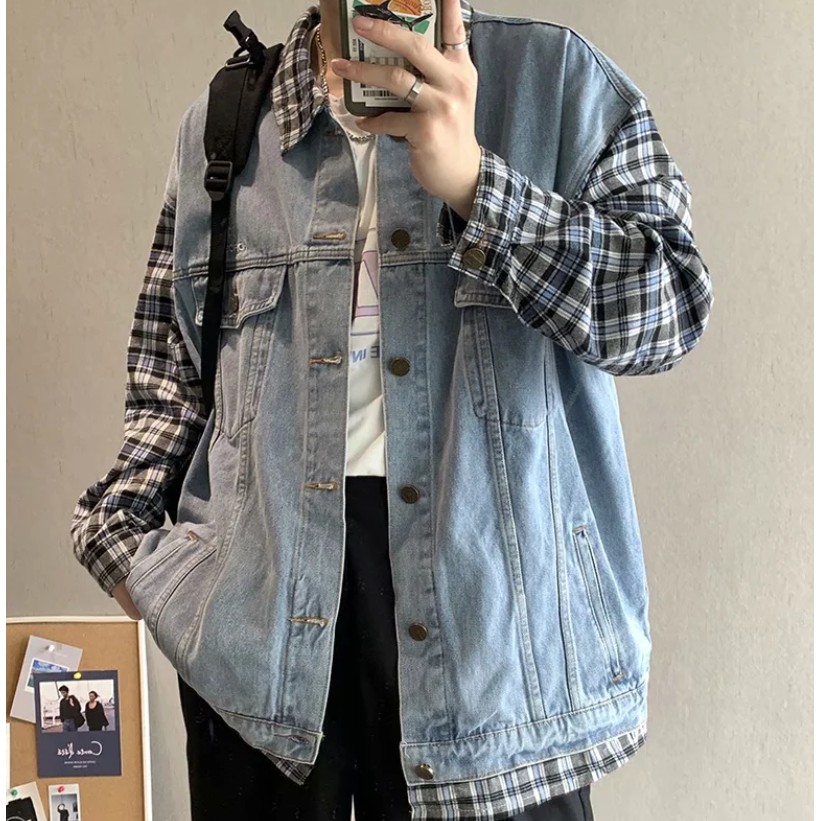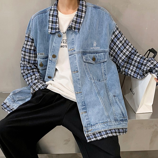 【M世代】 男生情侶假兩件牛仔外套 寬鬆拼接格子牛仔夾克男女牛仔夾克外套 新款潮流牛仔衣(CJK8851)