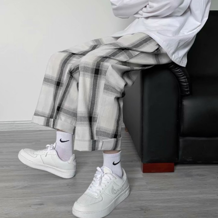 【M世代】『隔日到』格子褲 格紋褲 縮口褲 直筒褲 格子長褲 台灣發貨(MMK14)