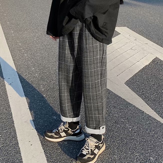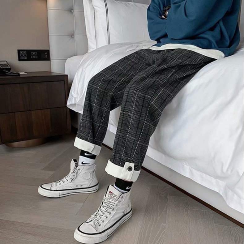 【M世代】格子褲 格紋褲毛呢 縮口褲 直筒褲 格子長褲(M2087)