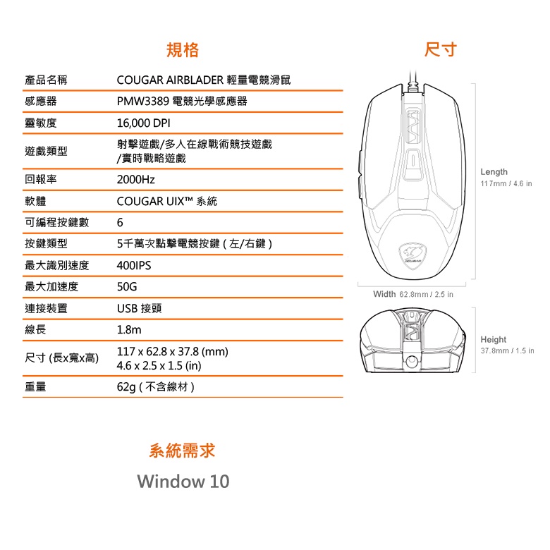 【COUGAR 美洲獅】 AIRBLADER 超輕量電競滑鼠