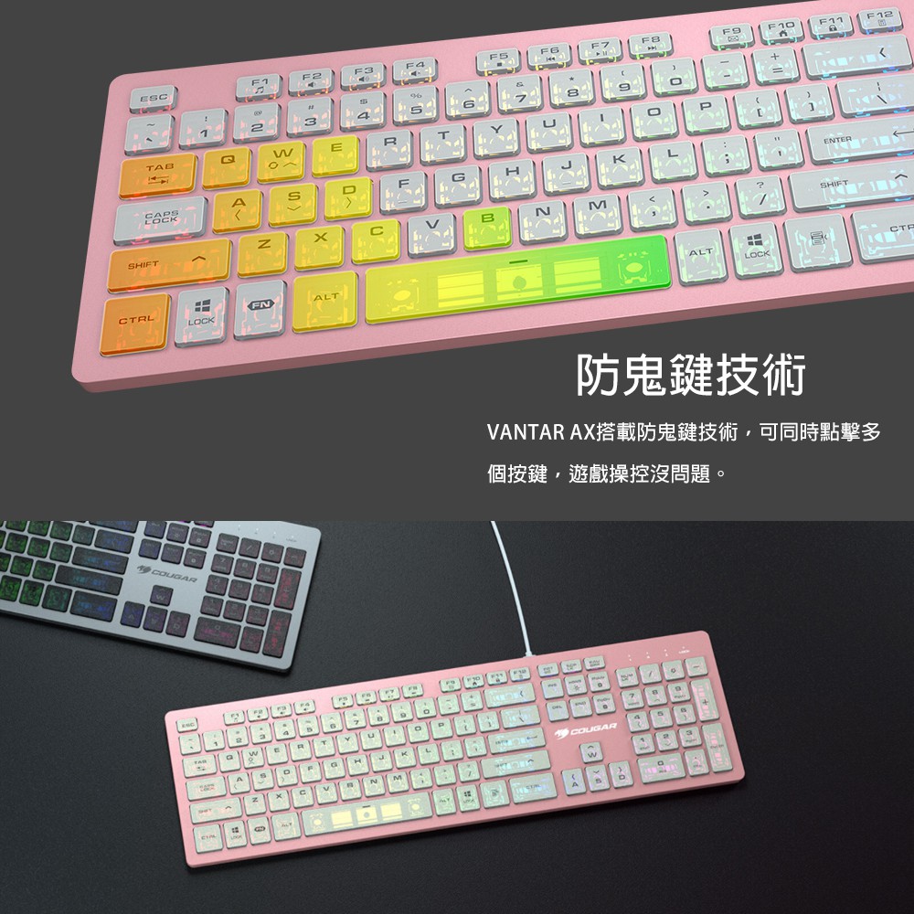 【COUGAR 美洲獅】VANTAR AX PINK 全鋁CNC剪刀腳RGB鍵盤 薄膜式電競鍵盤