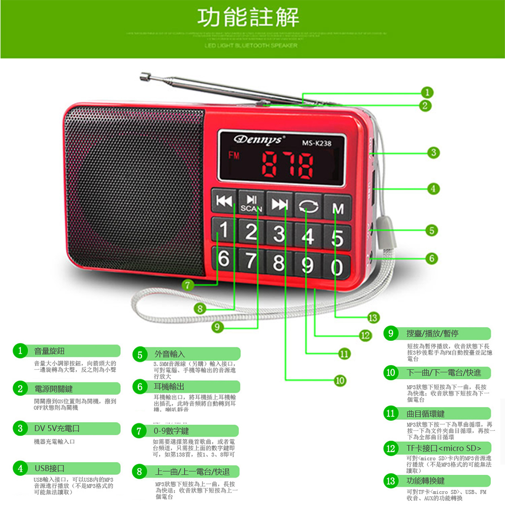 【Dennys】 MS-K238 隨身大字鍵插卡喇叭 支援USB SD FM MP3 隨身聽 收音機 大喇叭