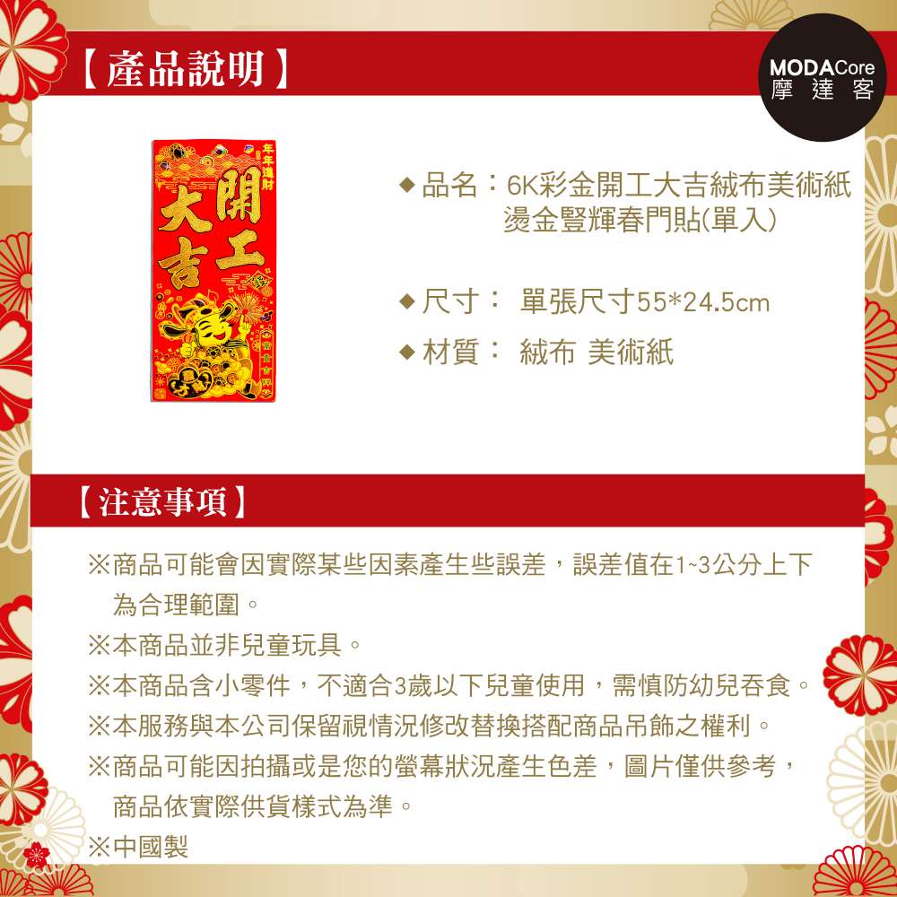 【農曆新年春節】高級6K彩金開工大吉絨布燙金豎輝春門貼春聯(單片入)