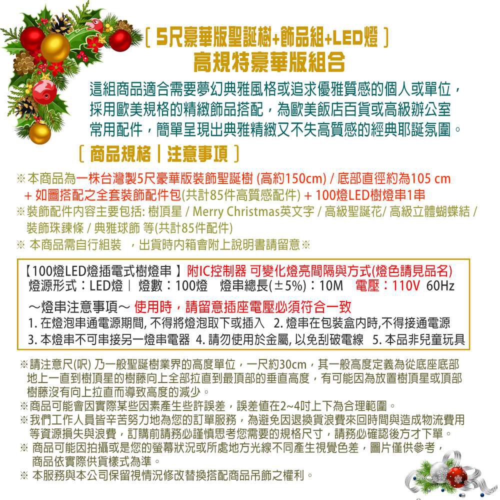 耶誕-台灣製5尺高規特豪華版綠聖誕樹(含絕美聖誕花蝴蝶結系配件)(含100燈LED燈暖白光1串-附控制器) 本島免運