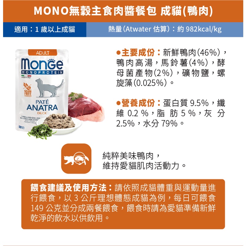 瑪恩吉Monge MONO無榖主食肉醬餐包 成貓(鴨肉) 85g