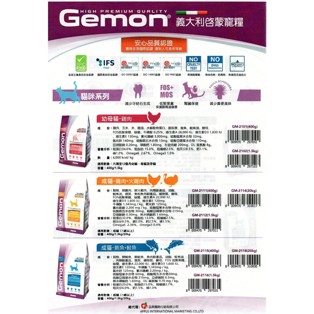 義大利GEMON 啓蒙 貓飼料系列 20kg