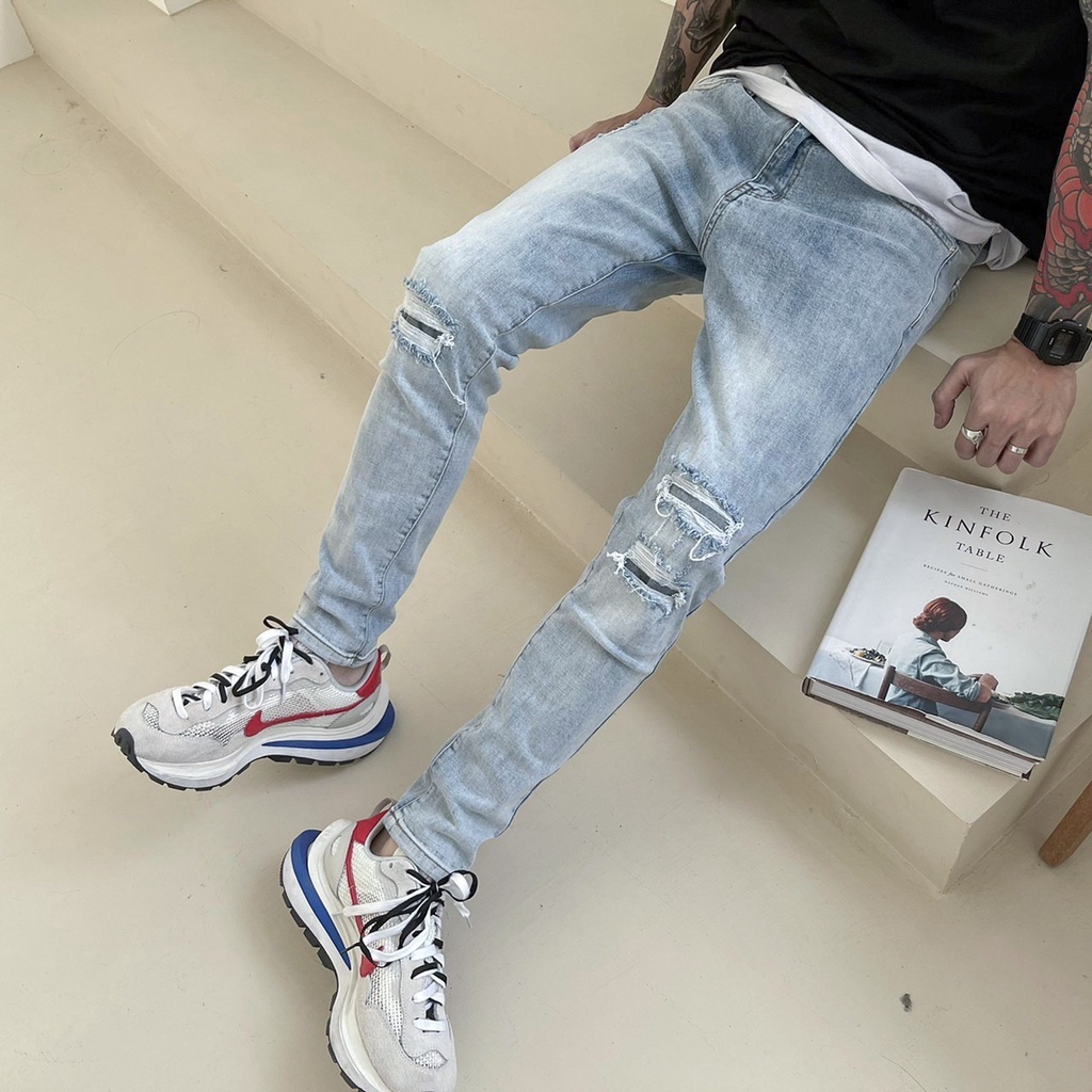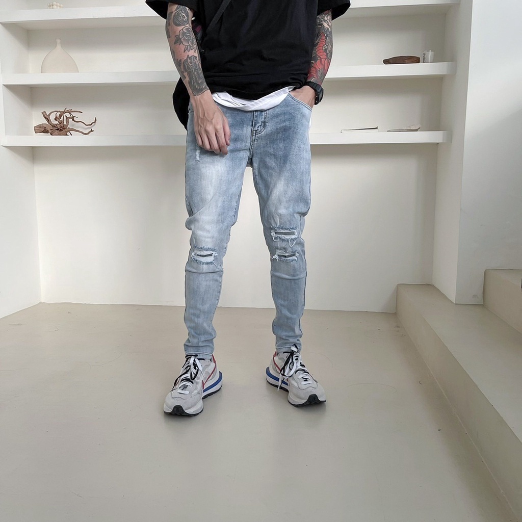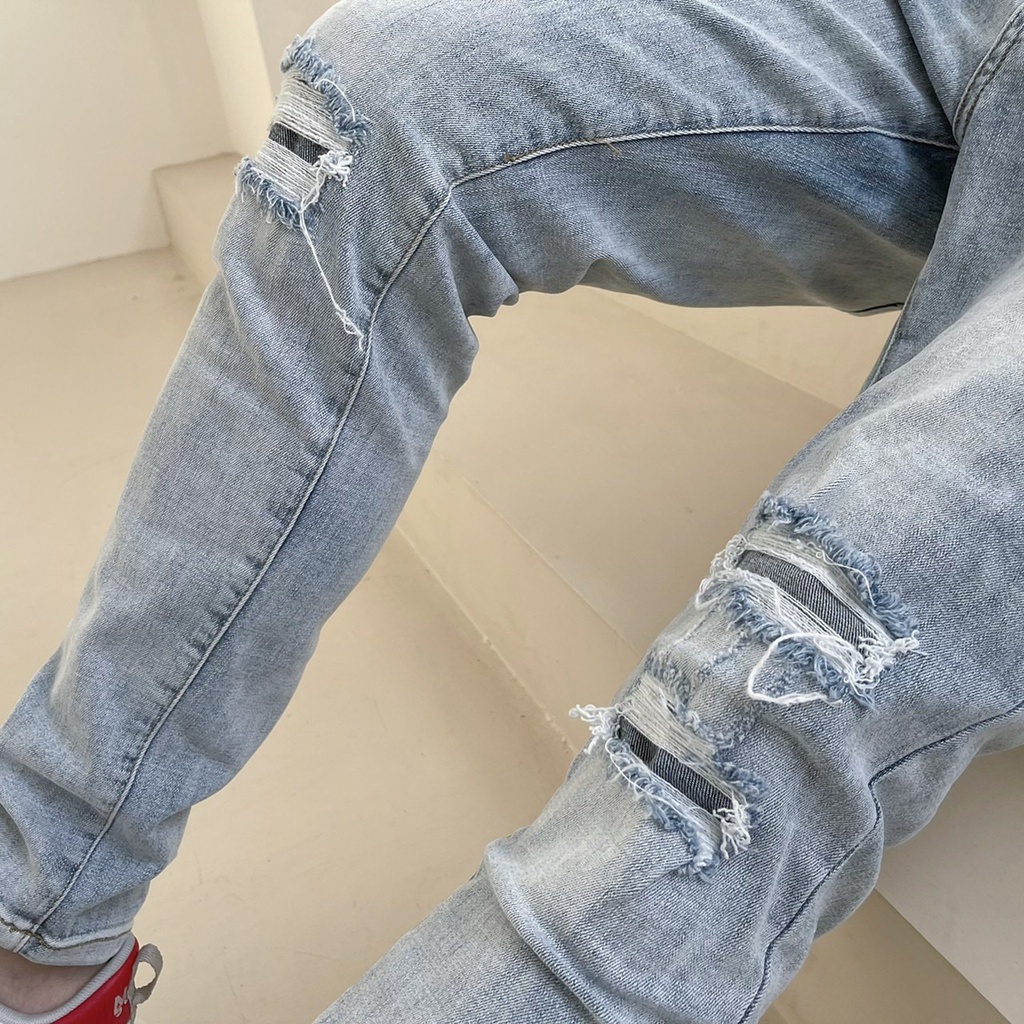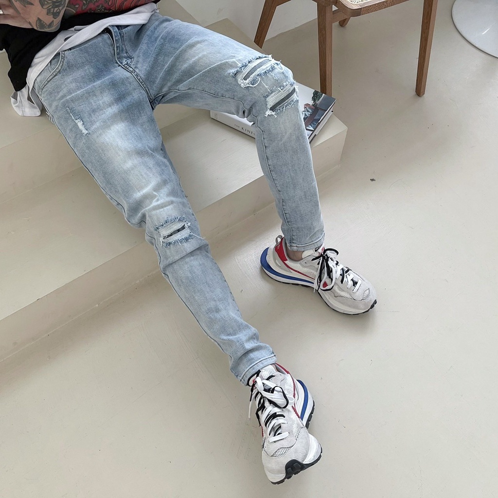 韓版 牛仔褲 多刀割淺藍牛仔褲 破壞加工 刀割破壞 淺藍刷色 刷舊 彈性 窄版 合身 煙管褲 男女可穿 50033