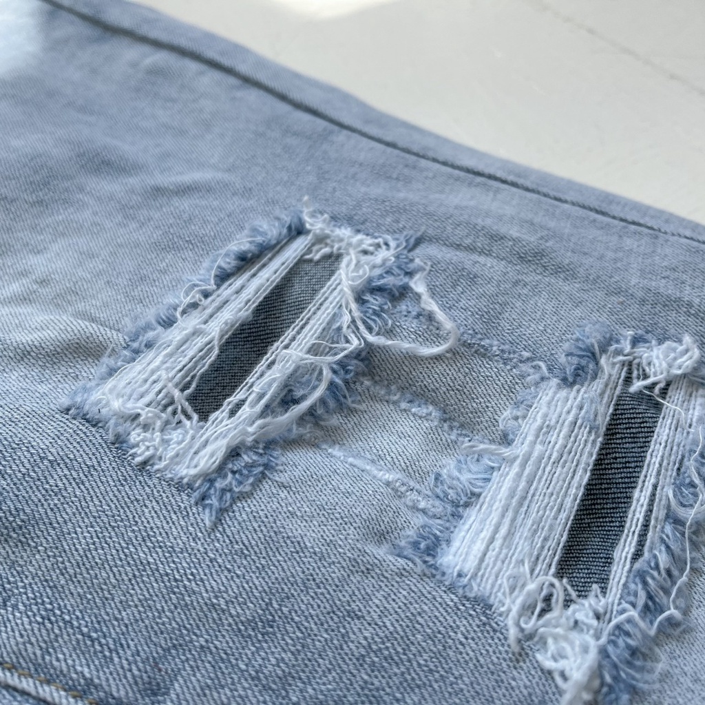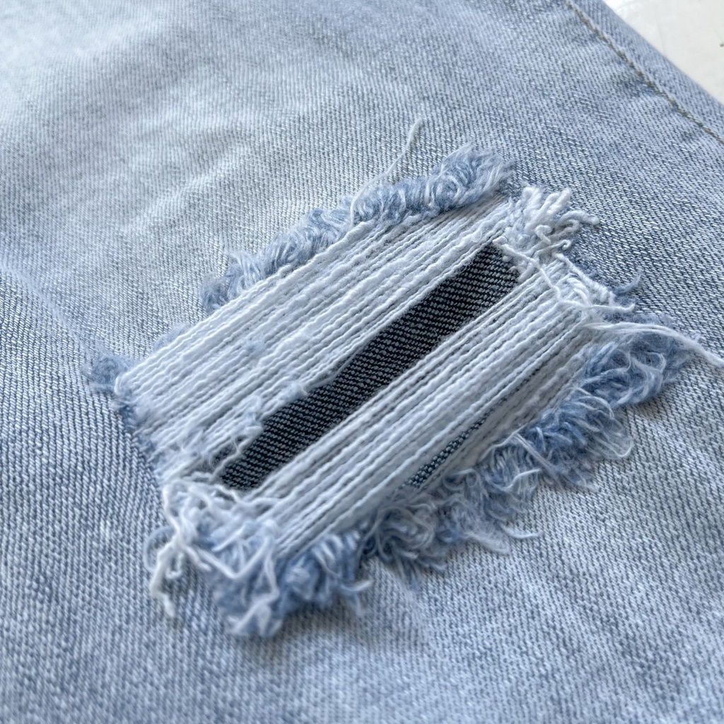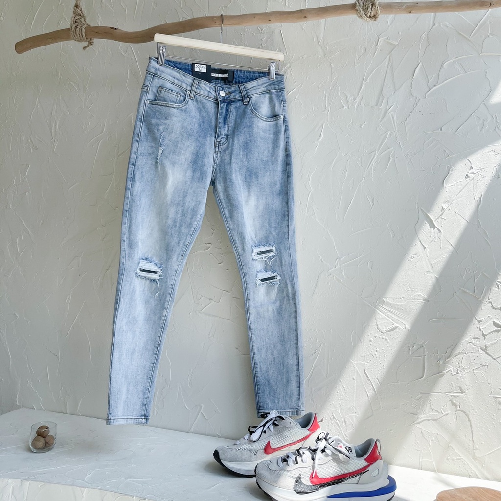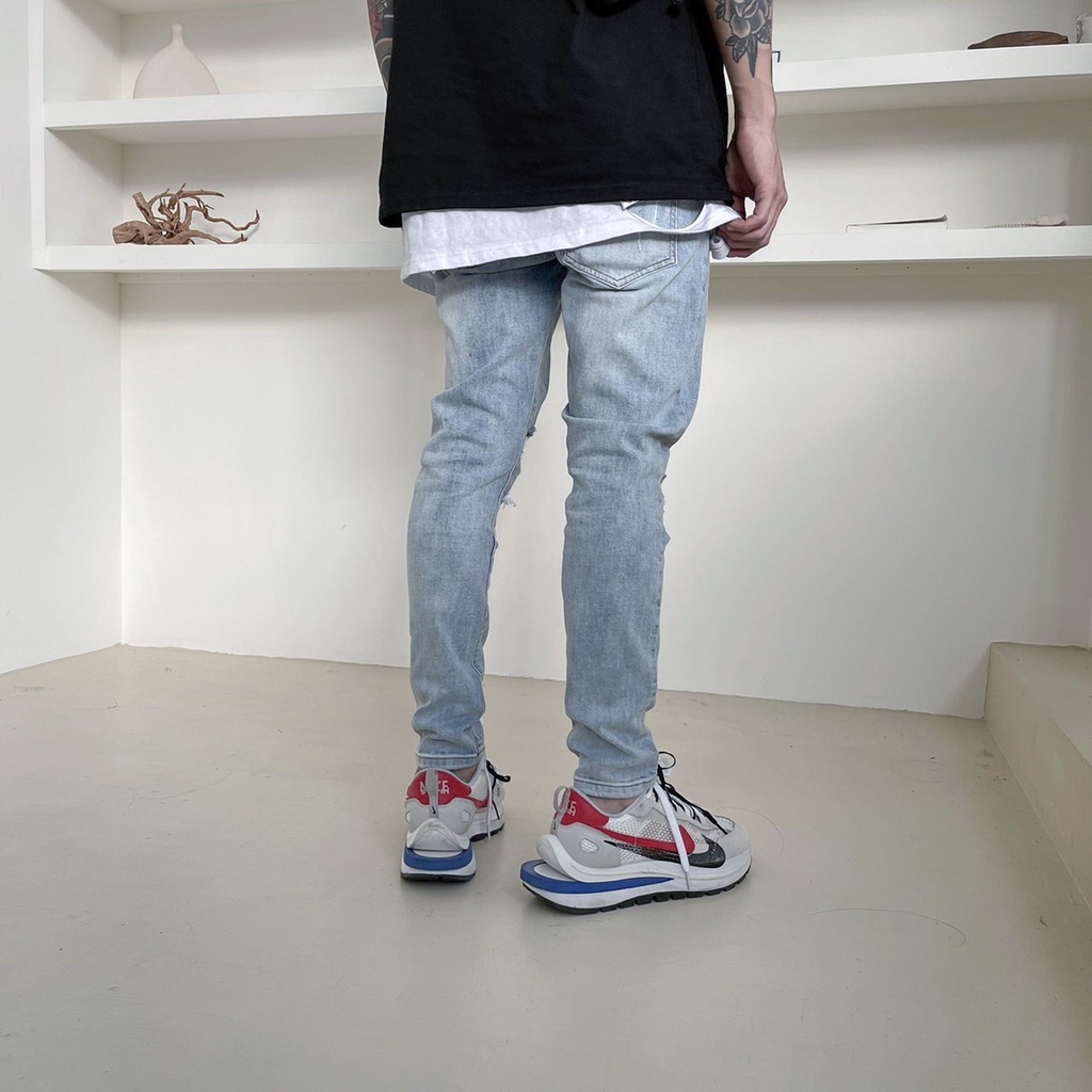 韓版 牛仔褲 多刀割淺藍牛仔褲 破壞加工 刀割破壞 淺藍刷色 刷舊 彈性 窄版 合身 煙管褲 男女可穿 50033