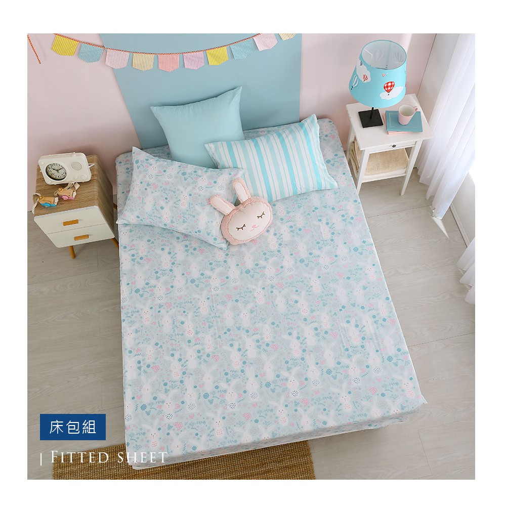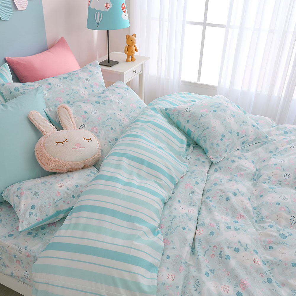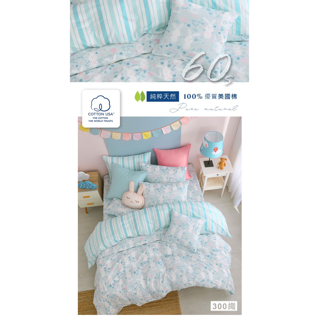 鴻宇 美國棉300織 床包枕套組 床包被套四件組 眠眠兔藍 台灣製2225