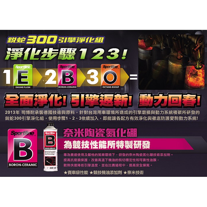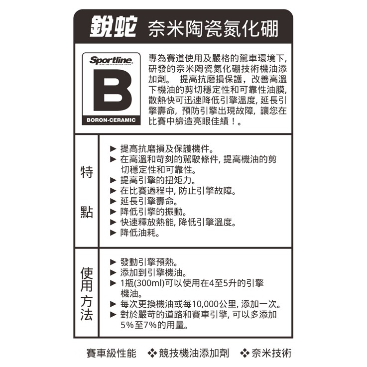 【 Sportline 】奈米陶瓷氮化硼 B 司博耐 降低引擎溫度 機油油精/油精 降低油耗 提高引擎扭力 哈家人