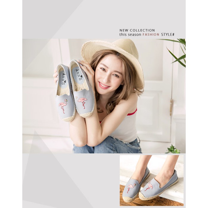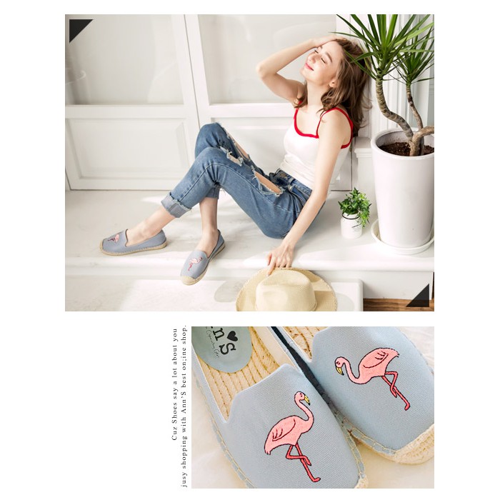 Ann’S時髦紅鶴手繪刺繡草編鞋-灰藍