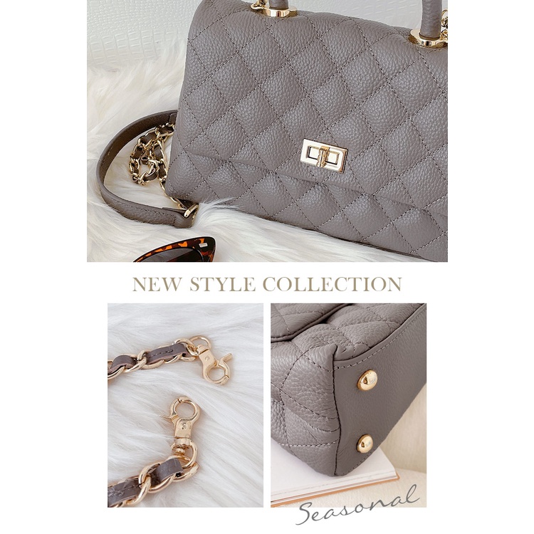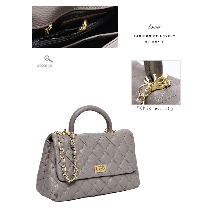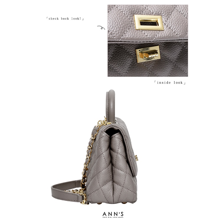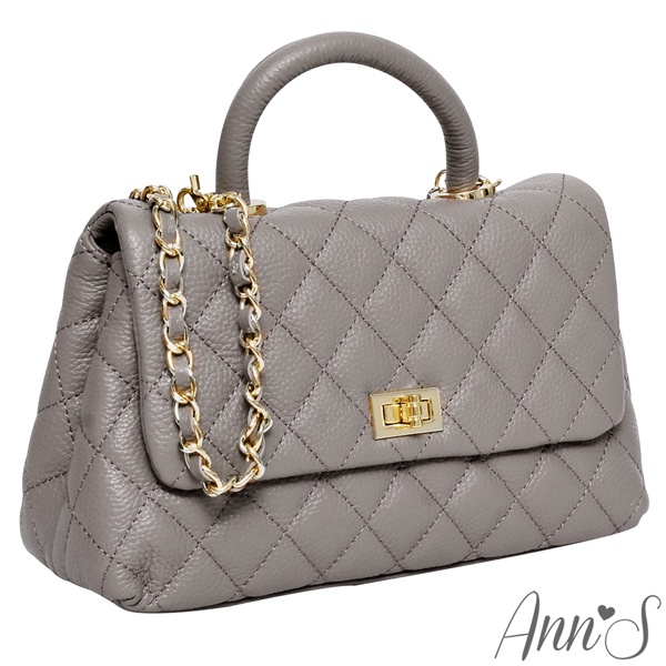 Ann’S法式優雅-全真皮牛皮手提把鍊條菱格紋包 -灰