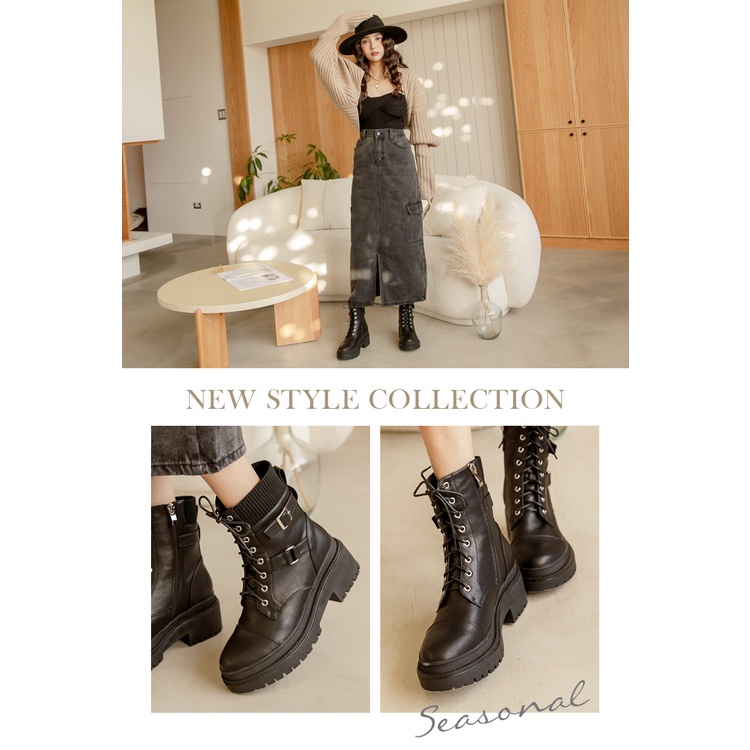 Ann’S打造漫畫腿-異材質拼接毛線靴筒綁帶個性輕量厚底軍靴5cm-黑