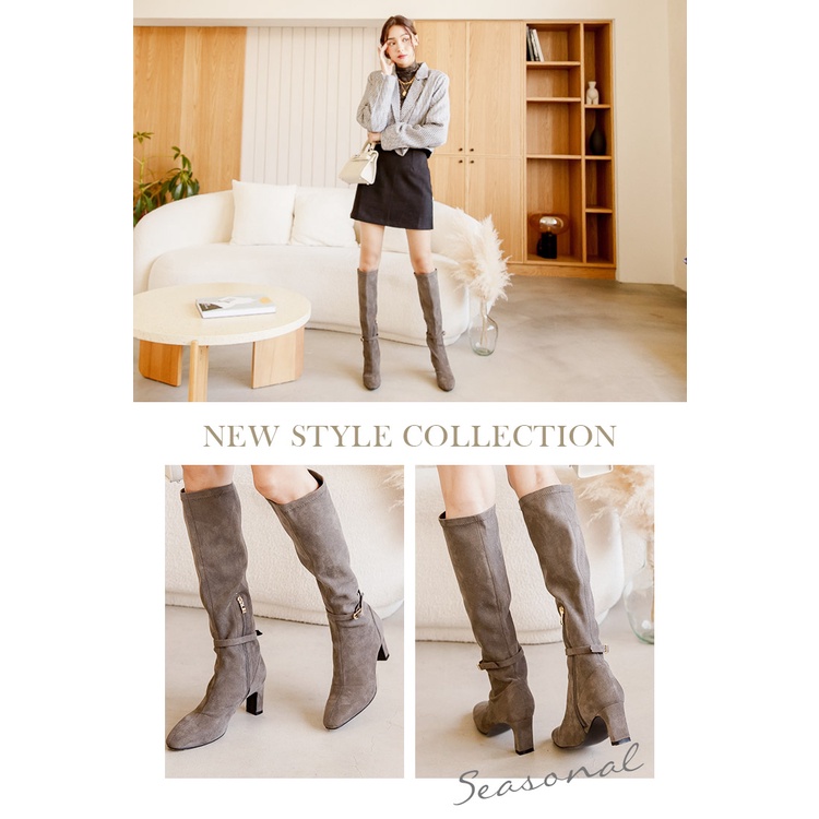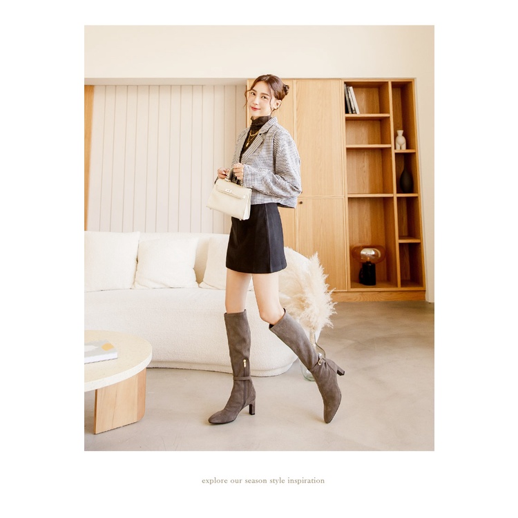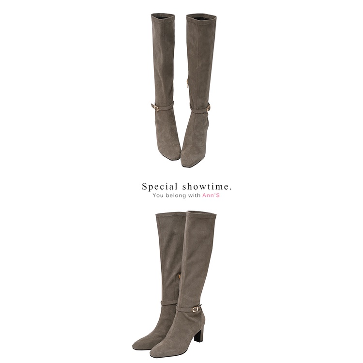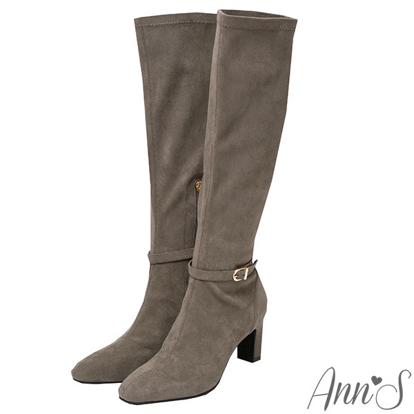 Ann’S精緻美感窄版-絨布可拆繫帶兩穿扁跟及膝長靴6.5cm-灰