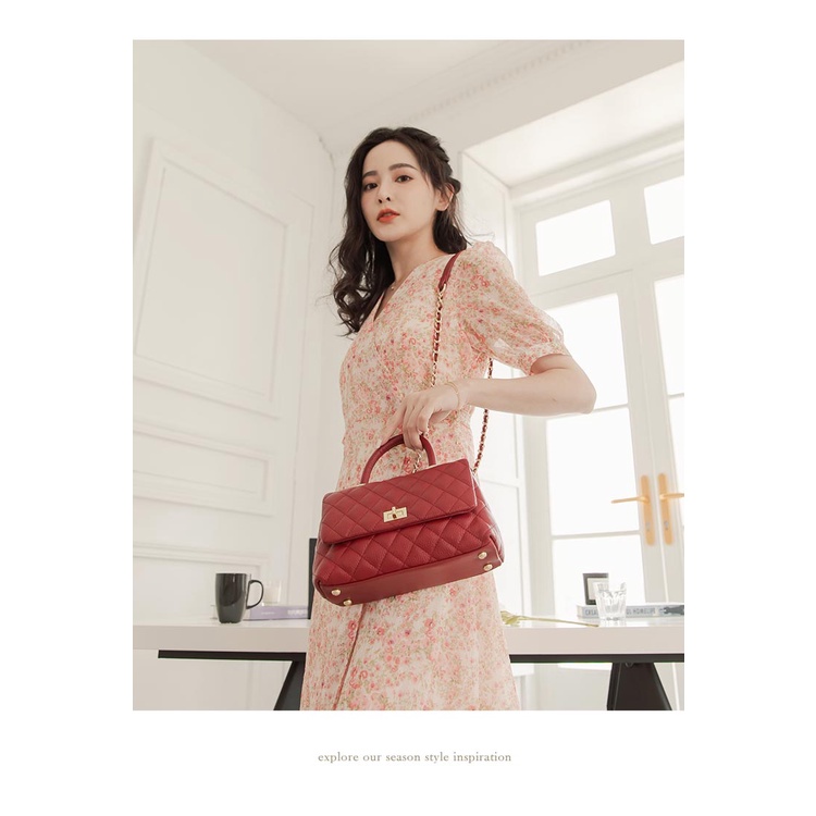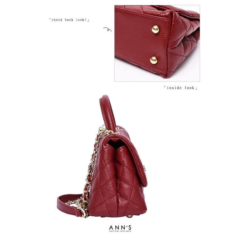 Ann’S法式優雅-全真皮牛皮手提把鍊條菱格紋包 -酒紅