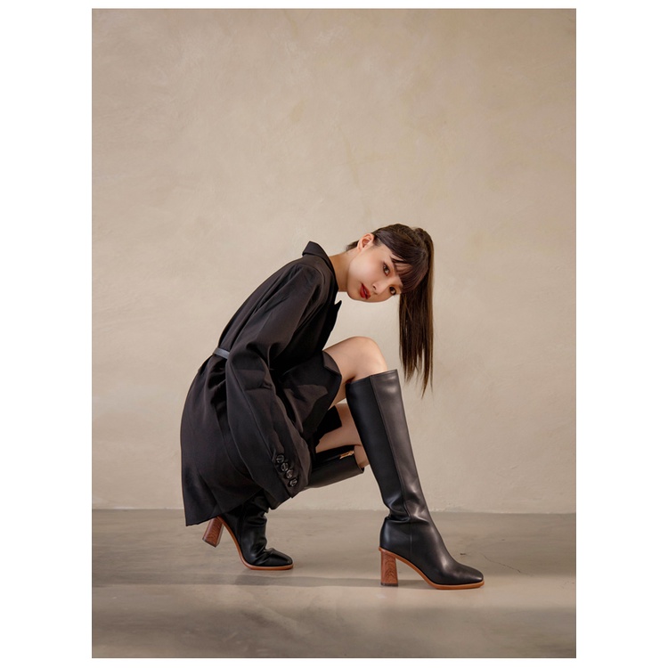 ANNSTAR彭彭PON聯名-時髦起來方頭粗跟好走及膝長靴6.5cm-黑