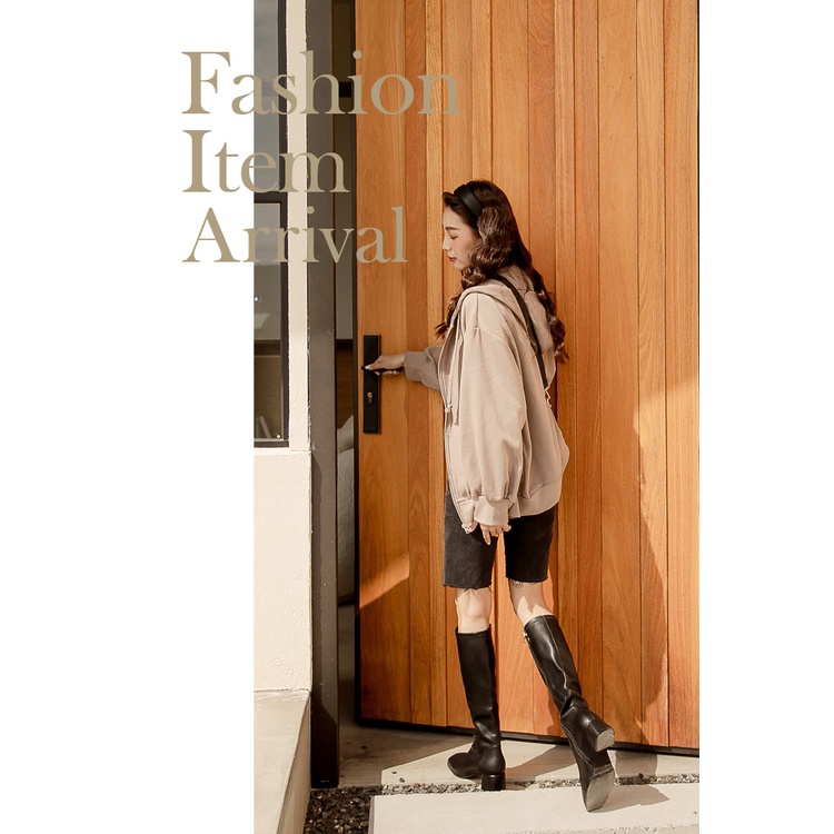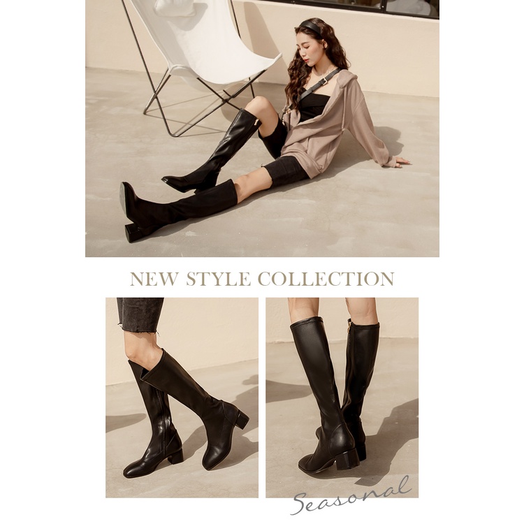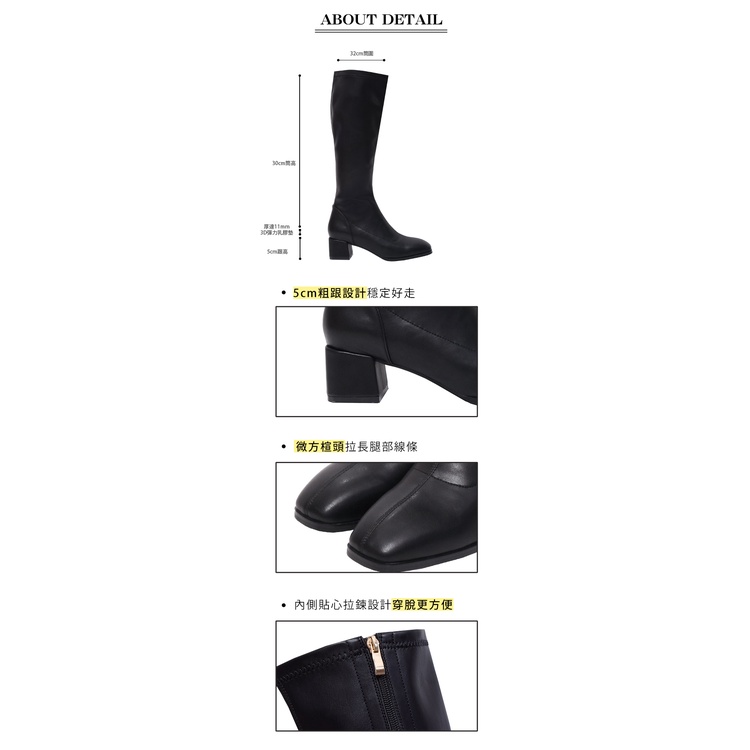 Ann’S有彈性的全素面粗跟及膝長靴5cm-黑