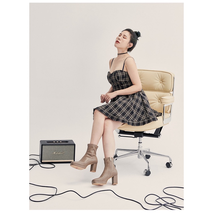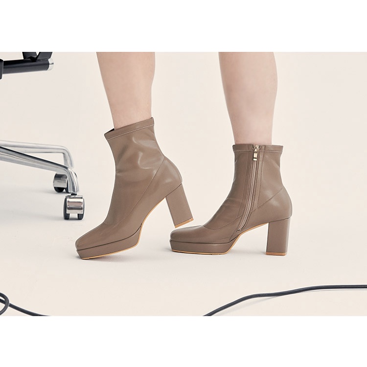 ANNSTAR丹妮婊姐聯名-彈力皮革貼腿防水台方頭粗跟短靴7.5cm-咖(版型偏大)