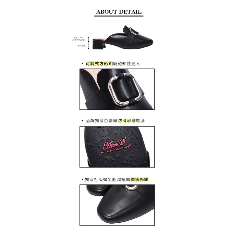 Ann’S生活常態-正方扣粗跟方頭穆勒鞋3cm-黑(版型偏小)