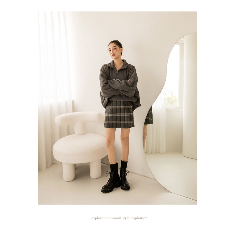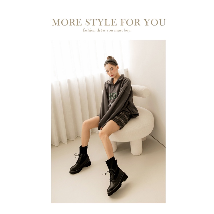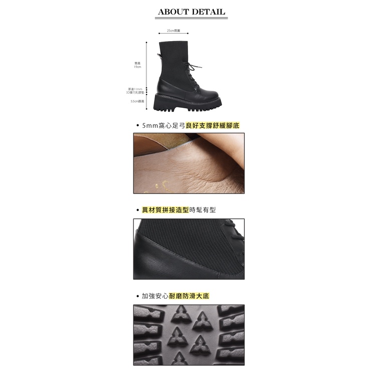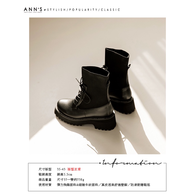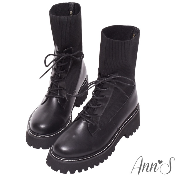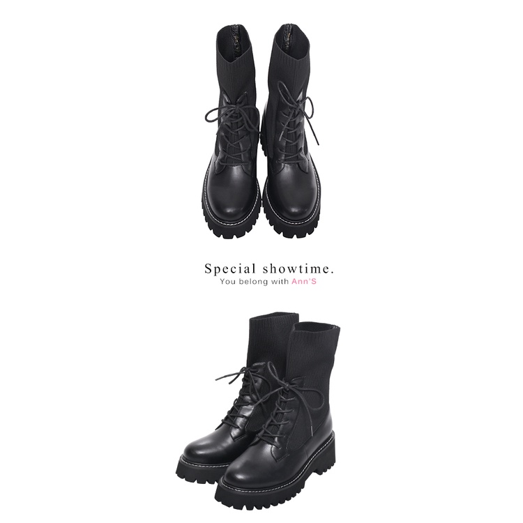 Ann’S異材質拼接貼腿飛織綁帶厚底軍靴5.5cm-黑