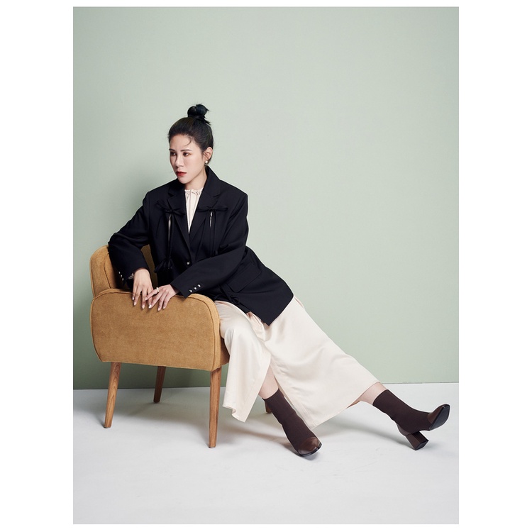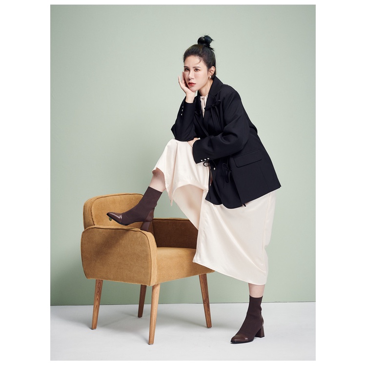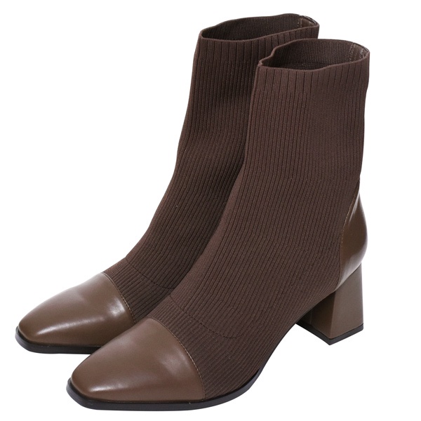 ANNSTAR丹妮婊姐聯名-異材質拼接貼腿飛織粗跟短靴6.5cm-深咖(版型偏小)