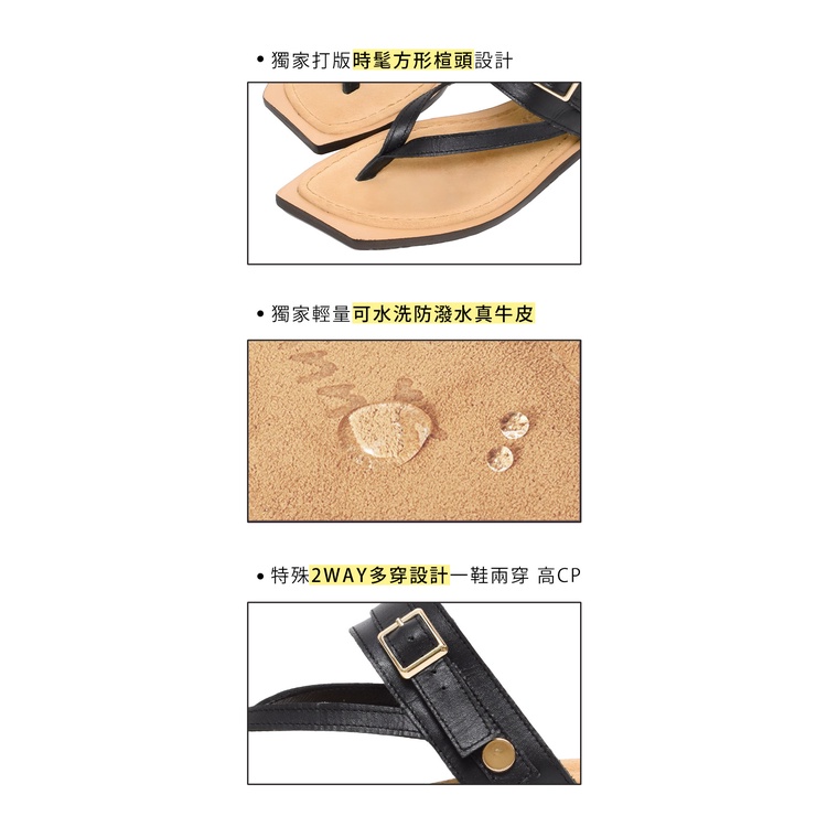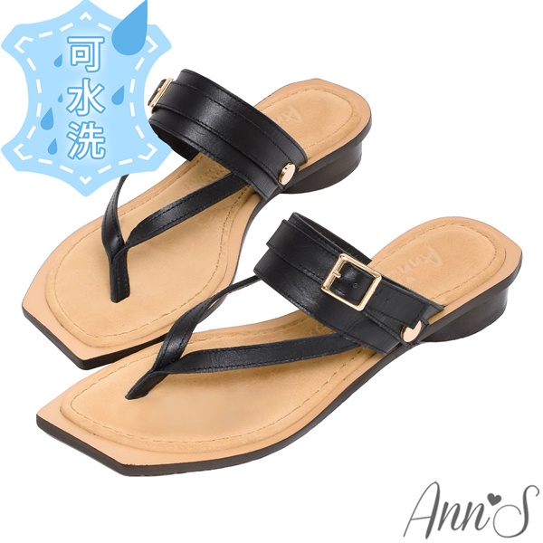 Ann’S水洗牛皮-真皮寬釦帶兩穿夾腳歐美斜方頭涼拖鞋3cm-黑