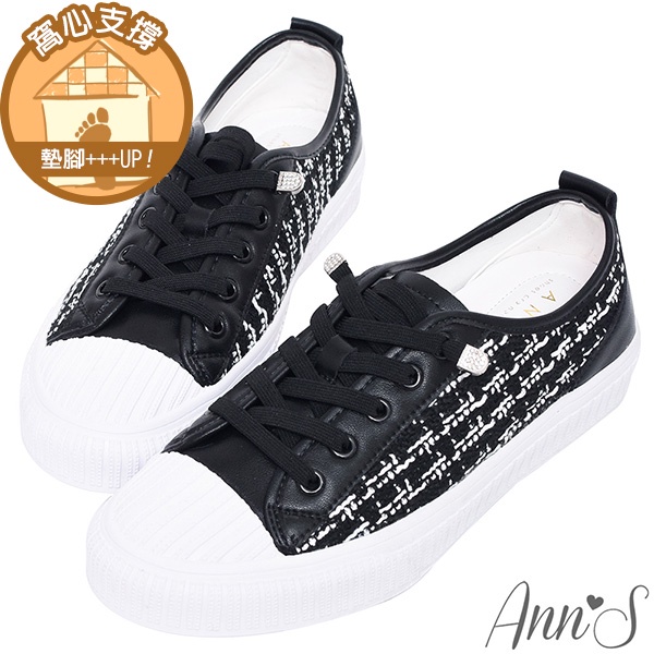 Ann’S免綁鞋帶!小香風混織毛呢牛皮小白鞋-黑