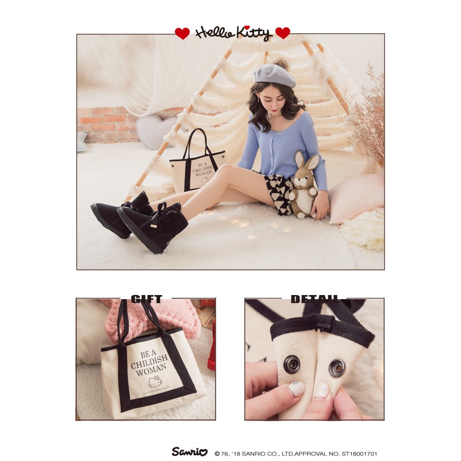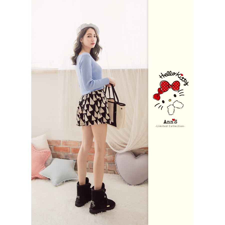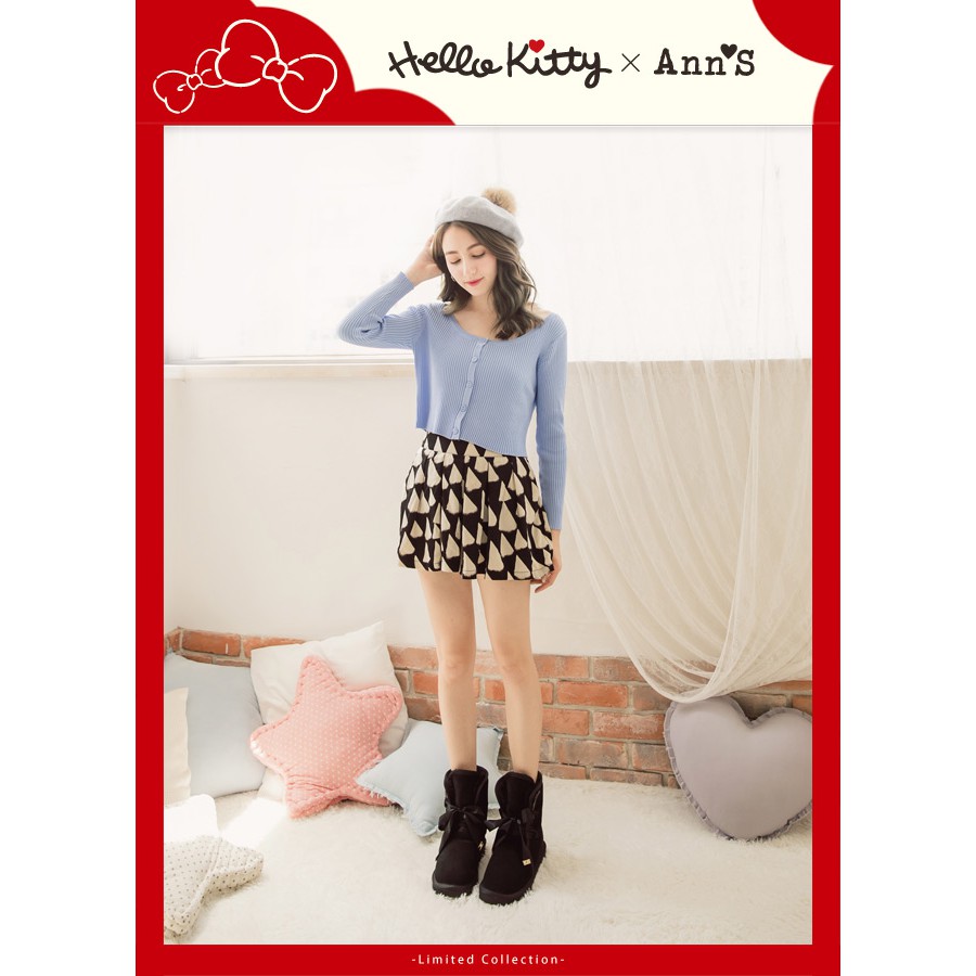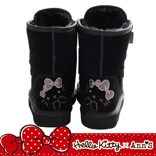 HELLO KITTY X Ann’S毛茸茸單色刺繡前綁緞帶蝴蝶結真皮雪靴-黑