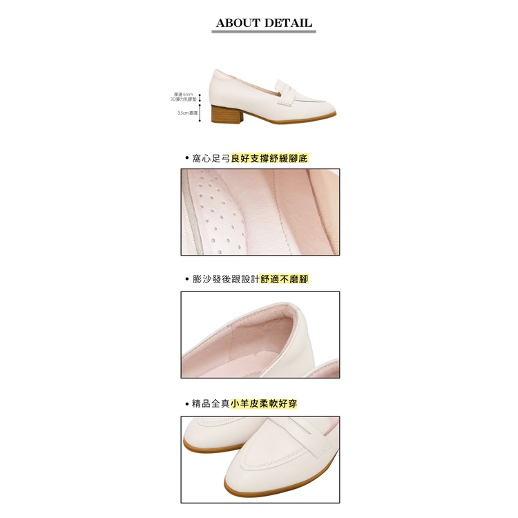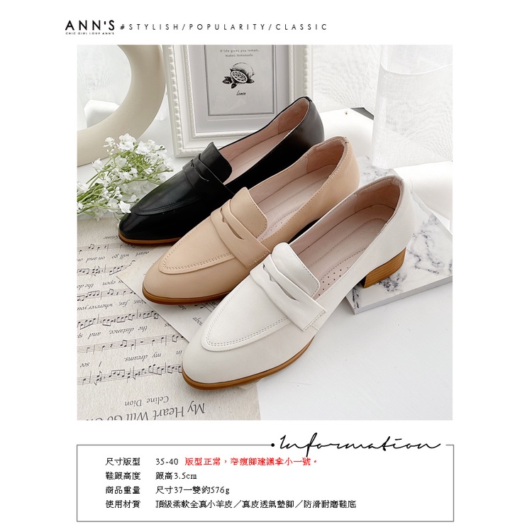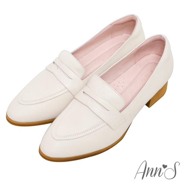 Ann’S氣質小文青-小羊皮全真皮素面木紋粗跟樂福鞋3.5cm-米白