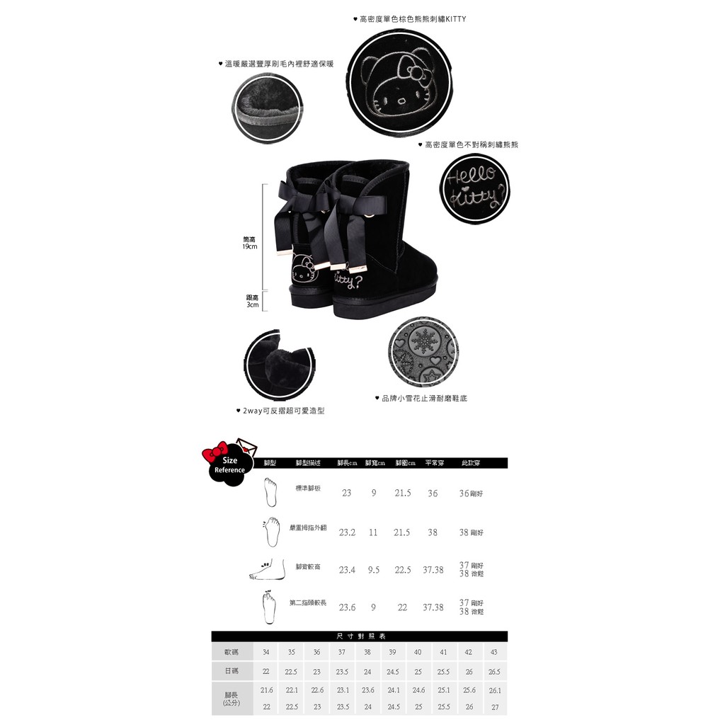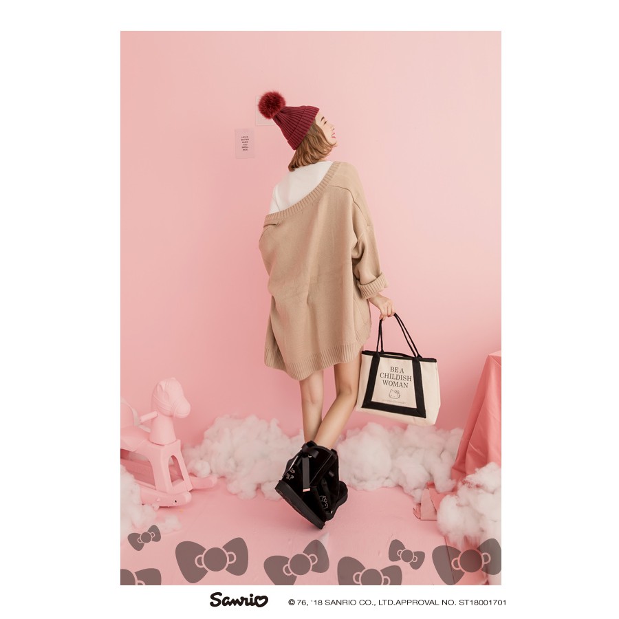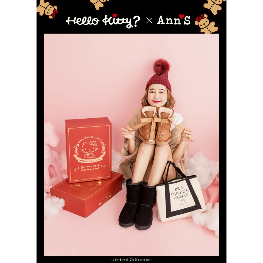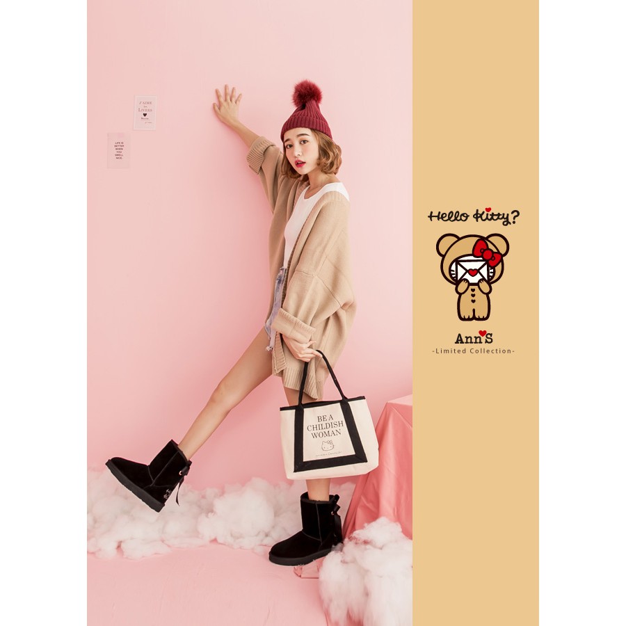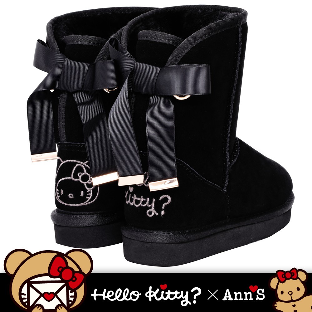 HELLO KITTY X Ann’S棕色熊熊單色刺繡後織帶蝴蝶結中筒真皮雪靴-黑