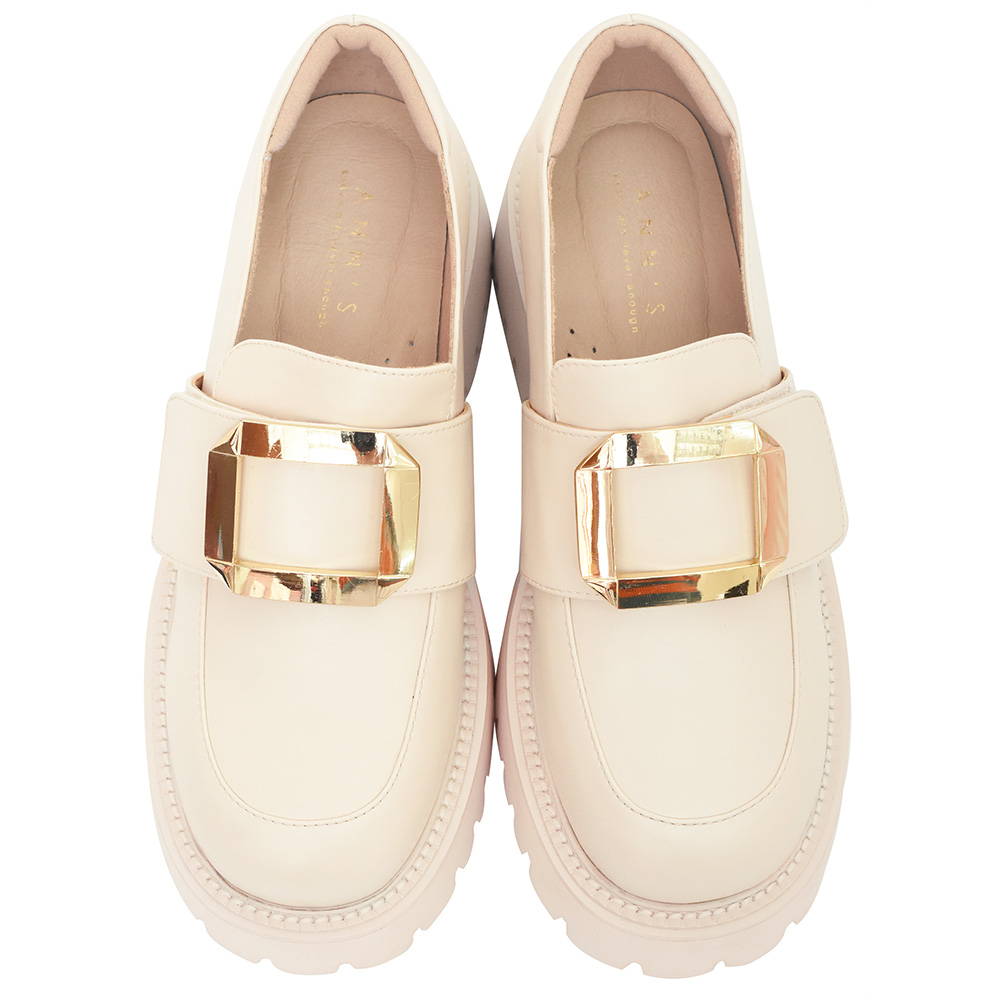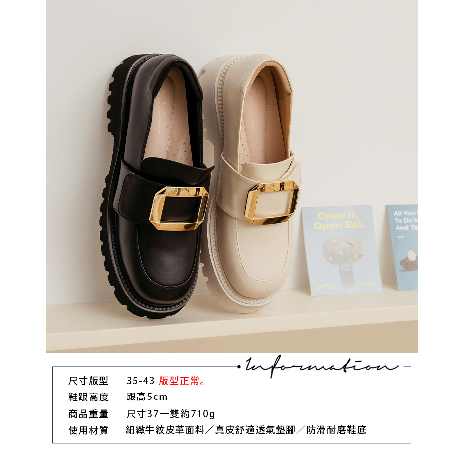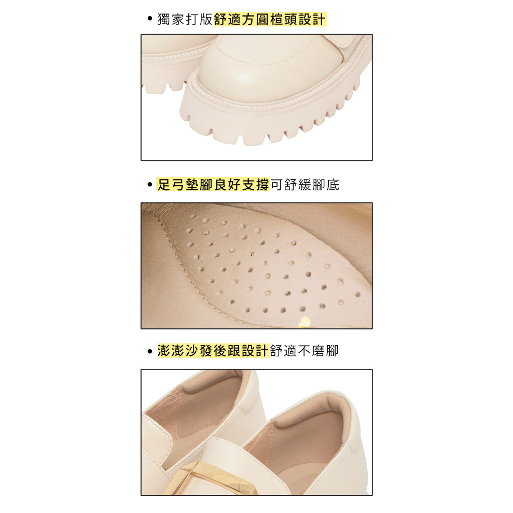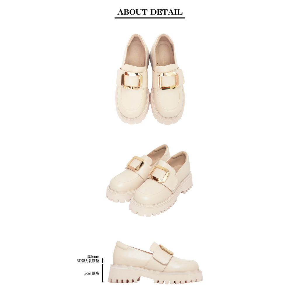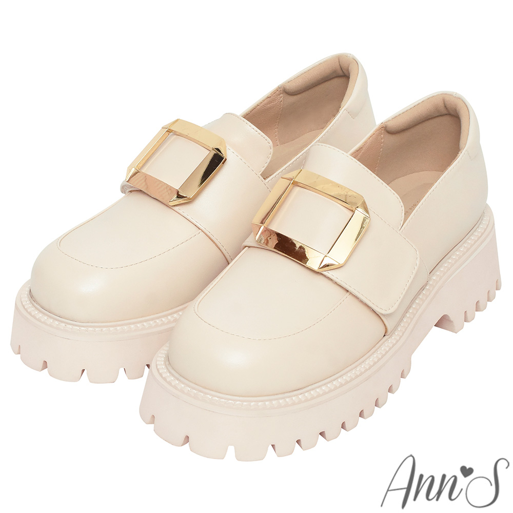 Ann’S可調整魔鬼氈-金色大方扣顯瘦輕量厚底樂福鞋5cm-米白