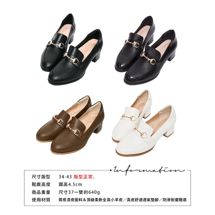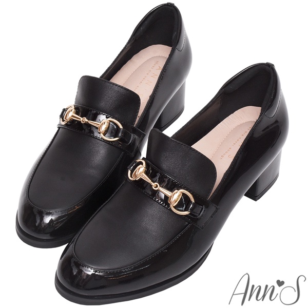 Ann’S質感拼接小羊皮金釦粗跟樂福鞋 4.5cm-漆皮黑