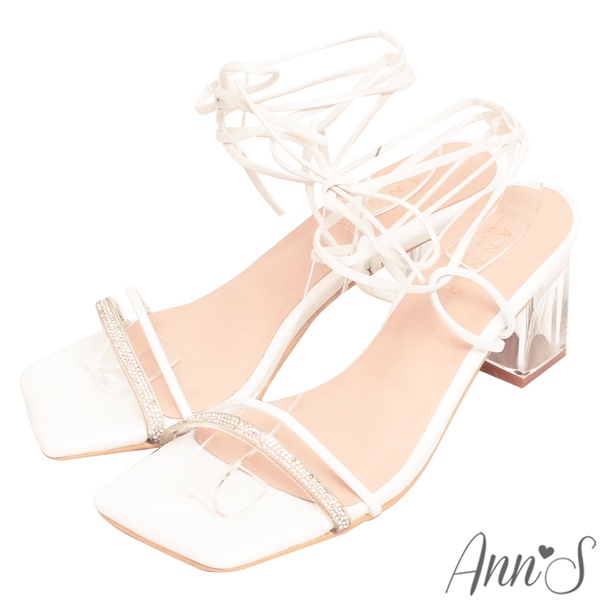 Ann’S夏日玻璃鞋-透明碎鑽一字綁帶粗跟方頭涼鞋-7.5cm-白