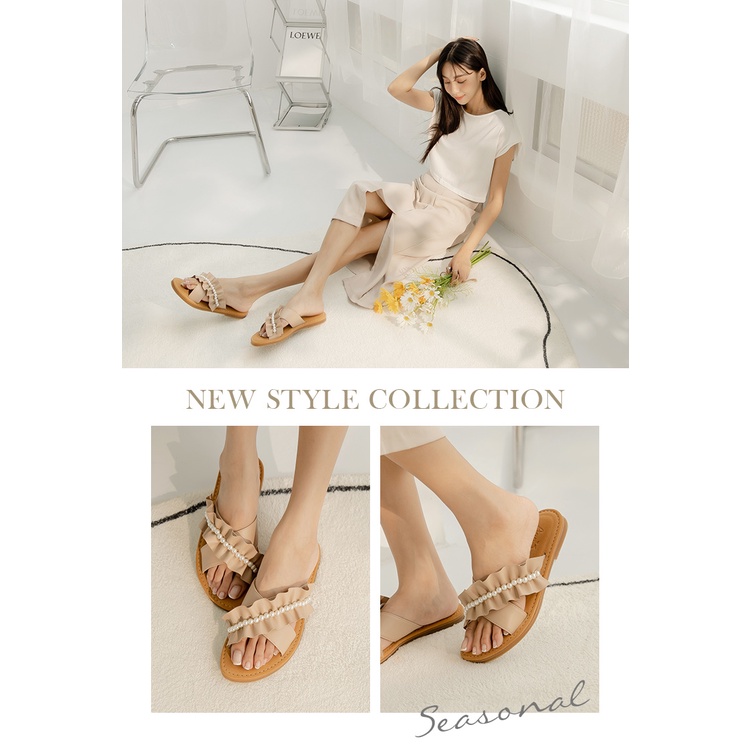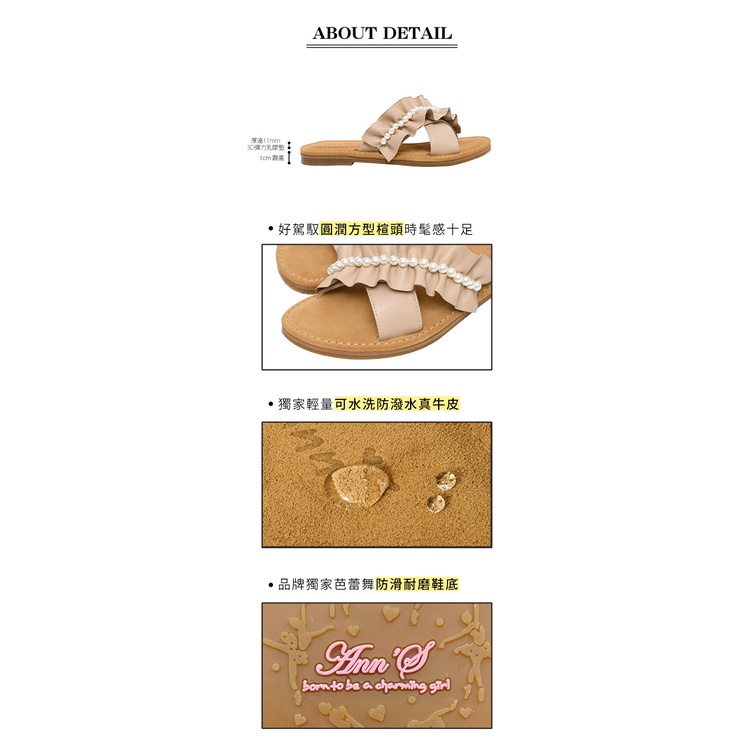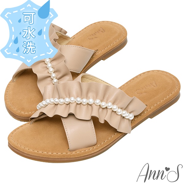 Ann’S水洗牛皮-珍珠花邊波浪寬腳友善圓頭涼鞋-杏