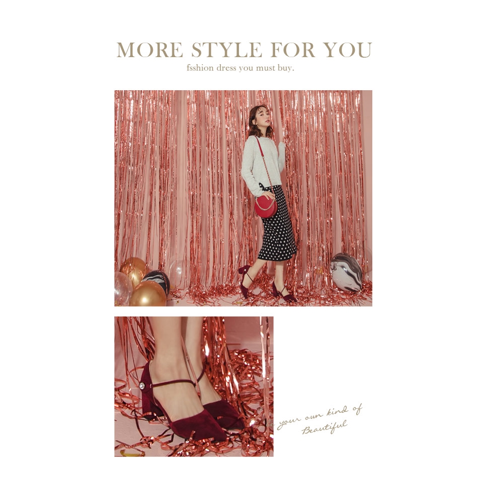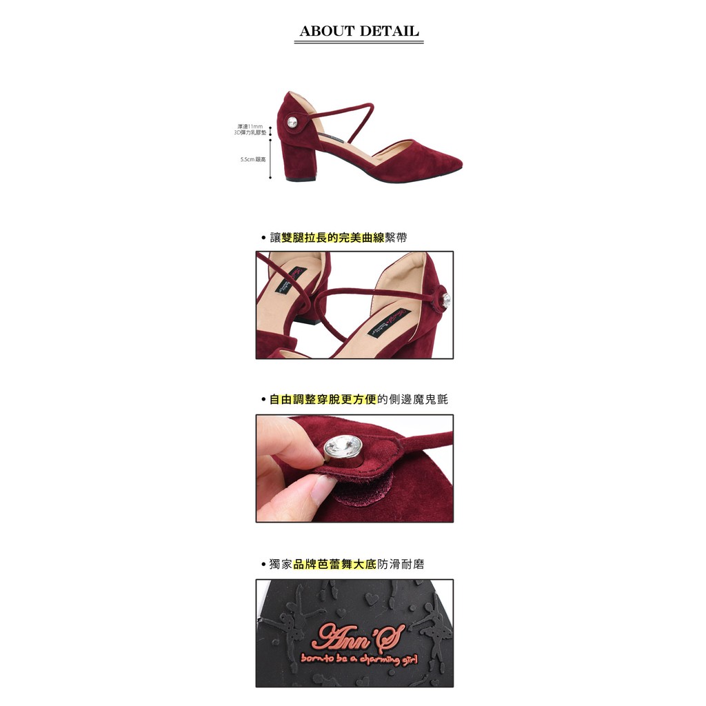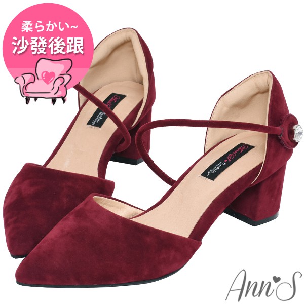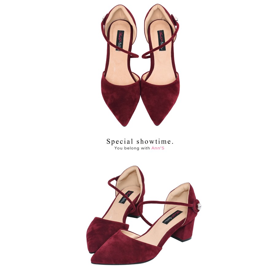Ann’S強烈女人味-顯瘦斜帶單鑽魔鬼氈粗跟尖頭鞋-酒紅