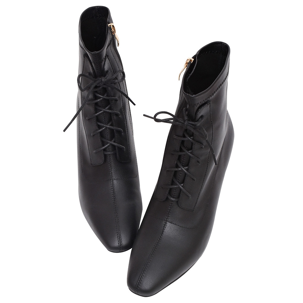 Ann’S時尚倫敦-綁帶造型羊皮真皮酒杯跟細跟方頭短靴6.5cm-黑