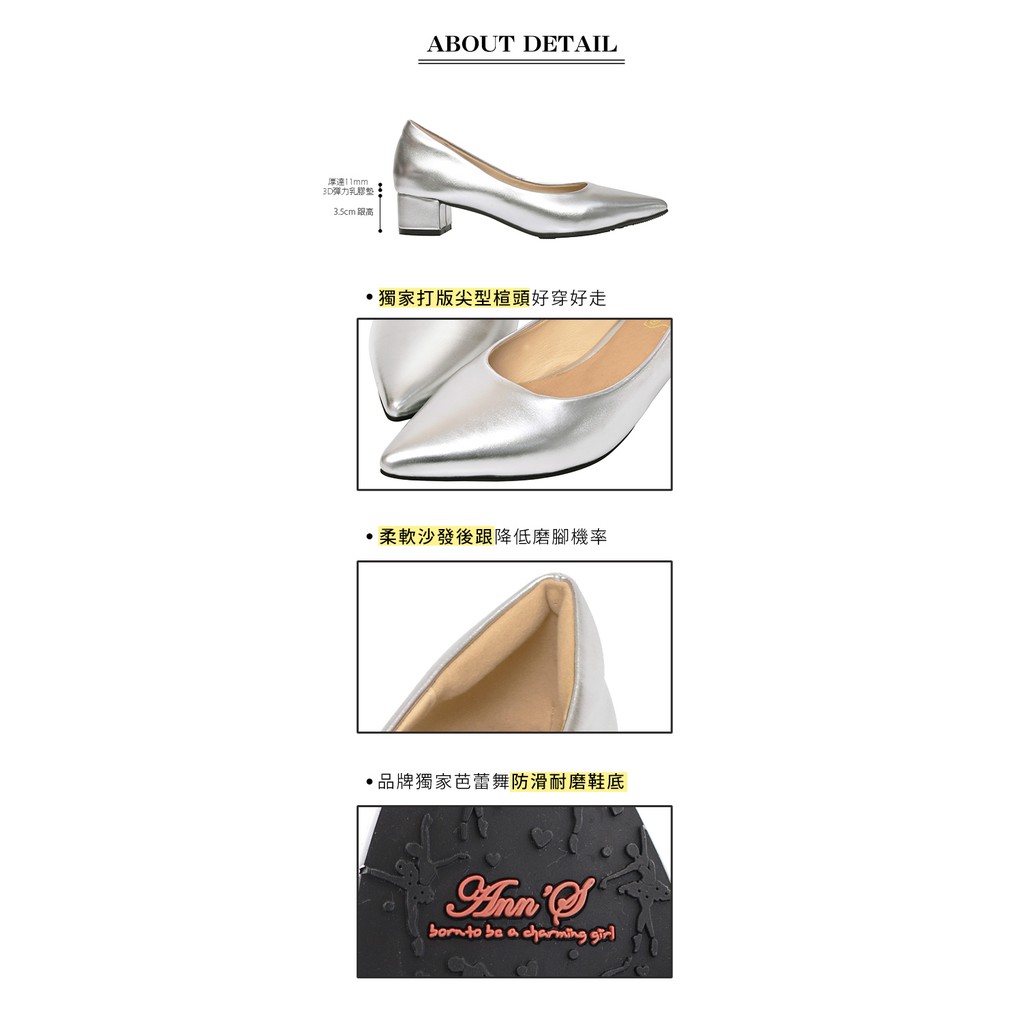 Ann’S加上優雅低跟版-復古皮革沙發後跟低跟尖頭鞋-銀