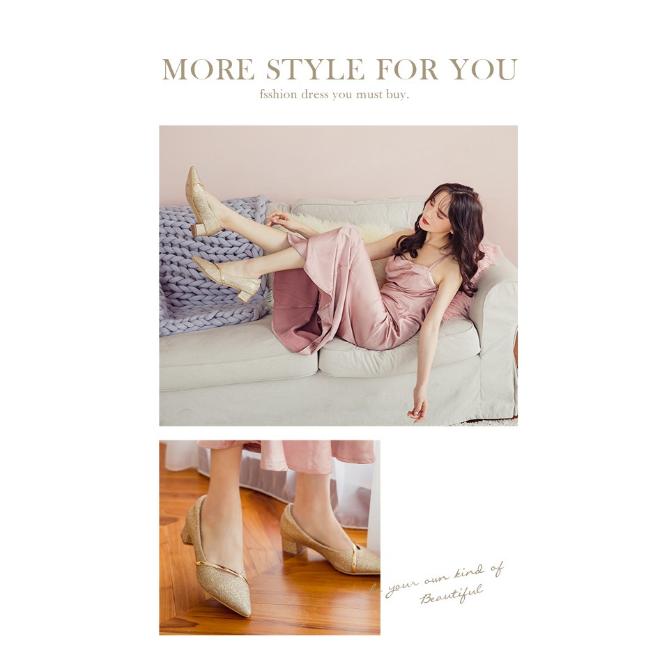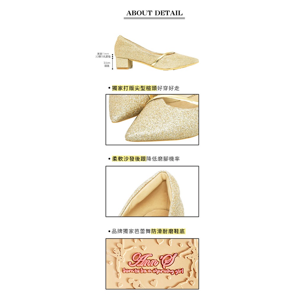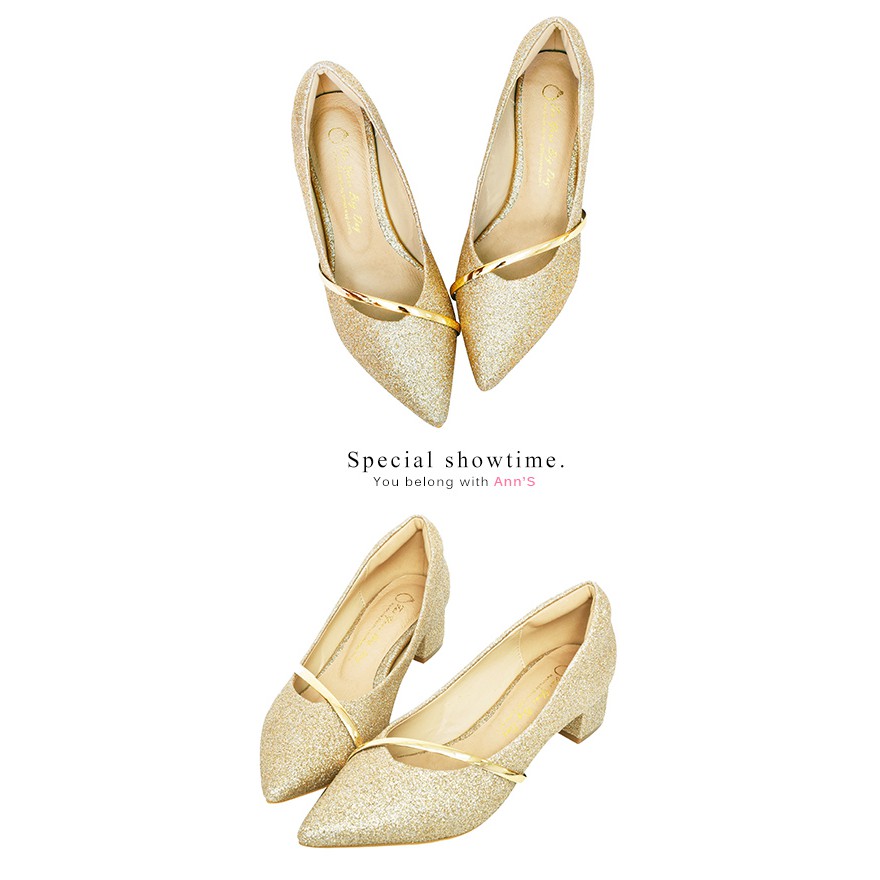Ann’S高挑公主的婚鞋-閃亮軟金屬斜帶顯瘦低跟尖頭鞋-金