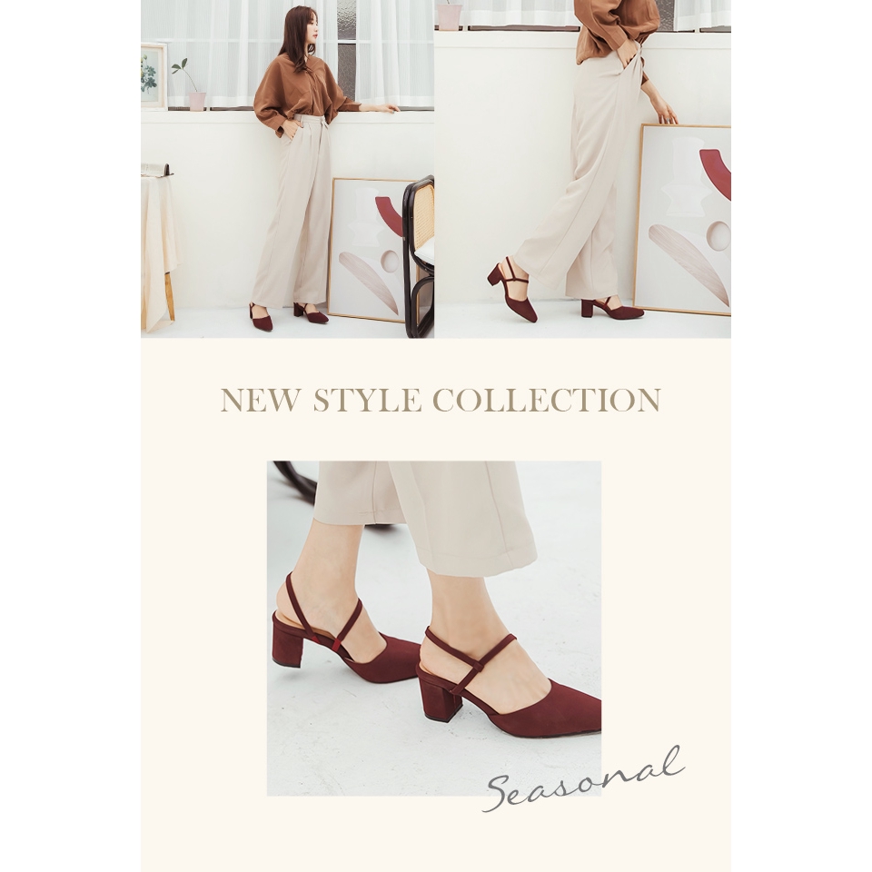 Ann’S霧感柔情-顯瘦腳背斜帶拉帶粗跟方頭跟鞋-酒紅