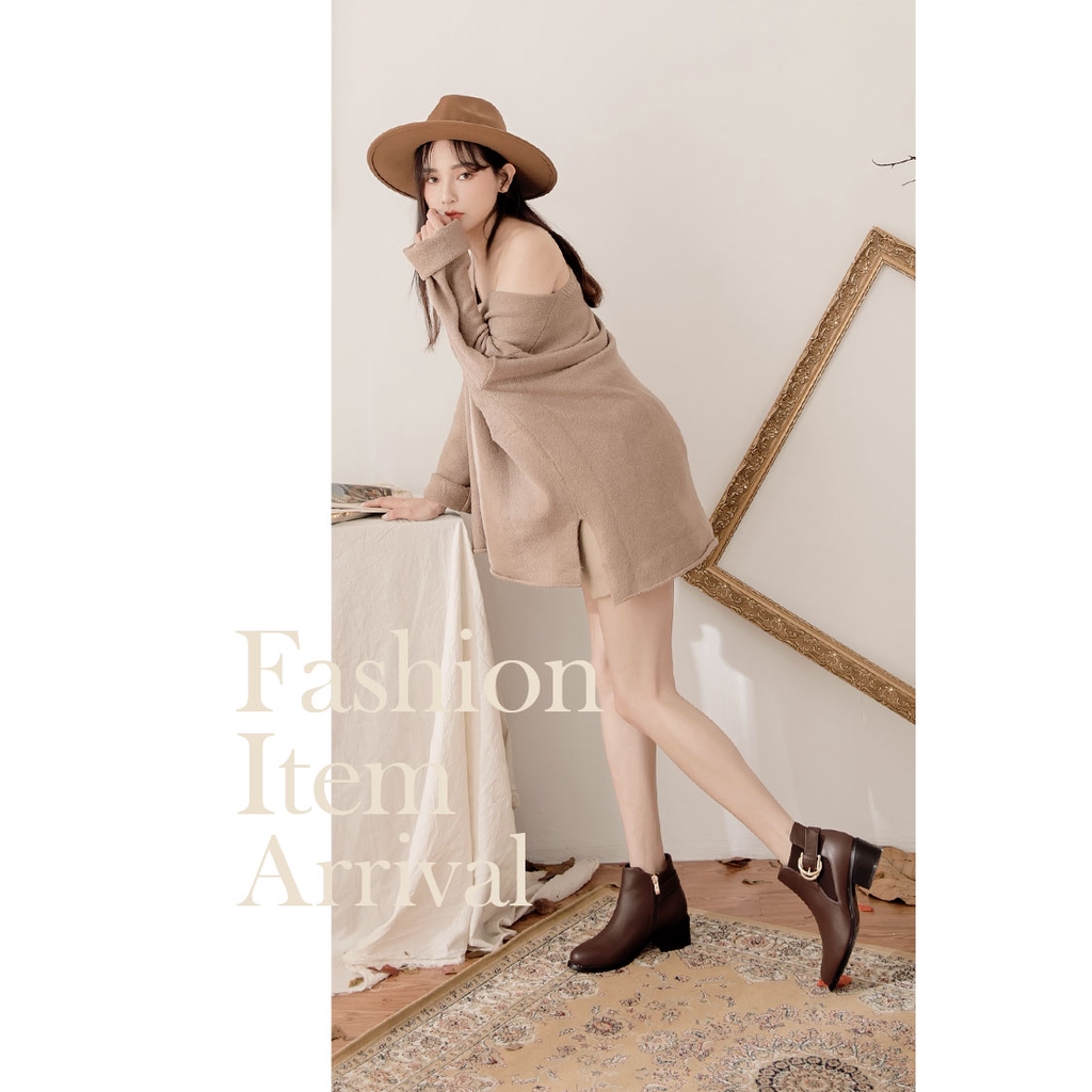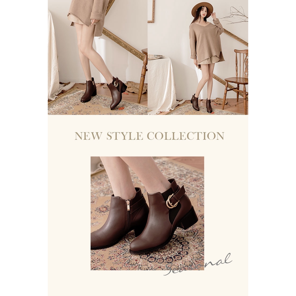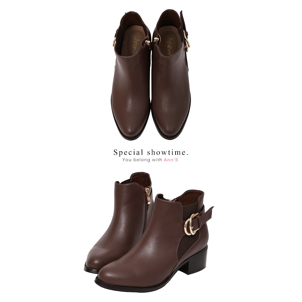 Ann’S時髦格調-側邊鬆緊雙層金色扣帶粗跟短靴4.5cm-咖