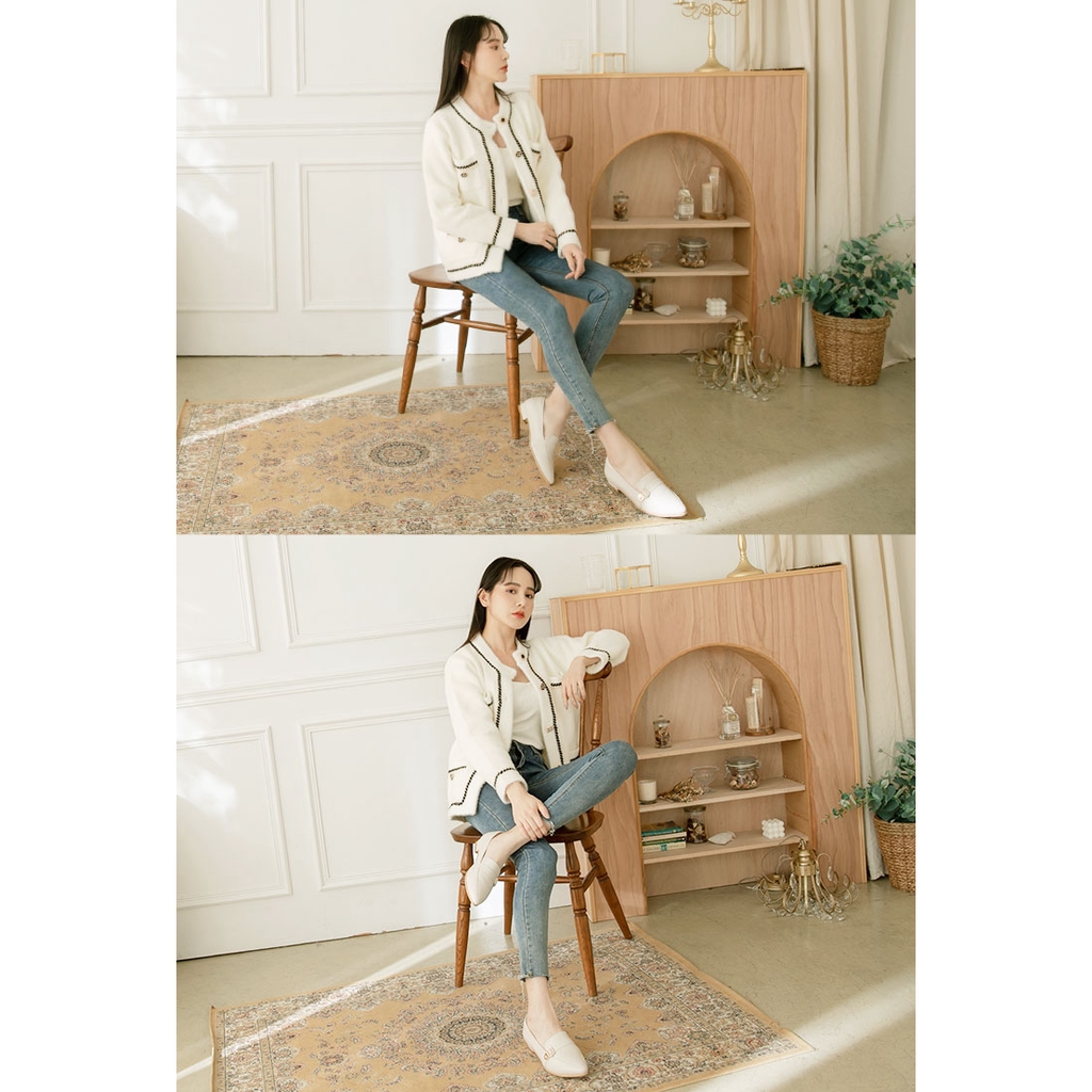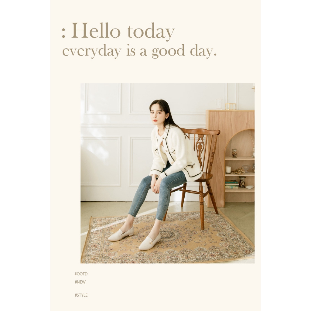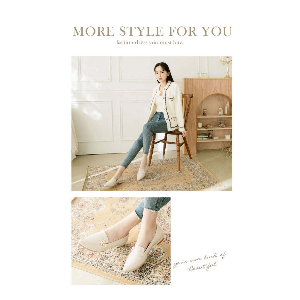 Ann’S綿羊皮真皮金釦加寬楦尖頭低跟樂福鞋-米白