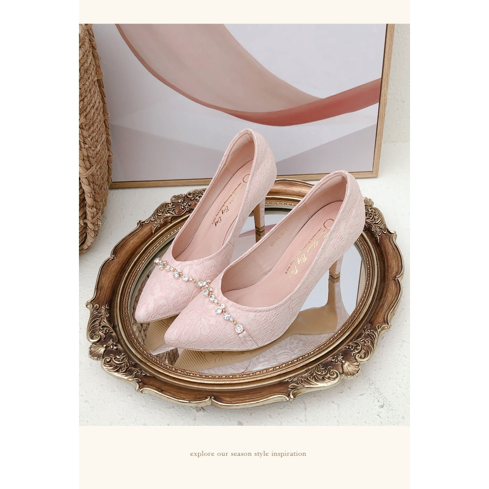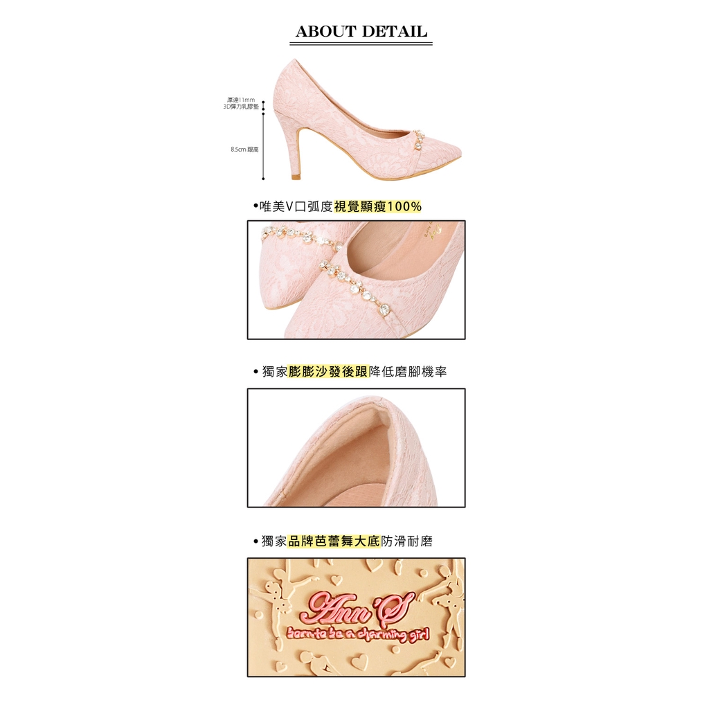 Ann’S韓式小清新-氣質鑽鍊蕾絲V口顯瘦尖頭婚鞋8.5cm-粉