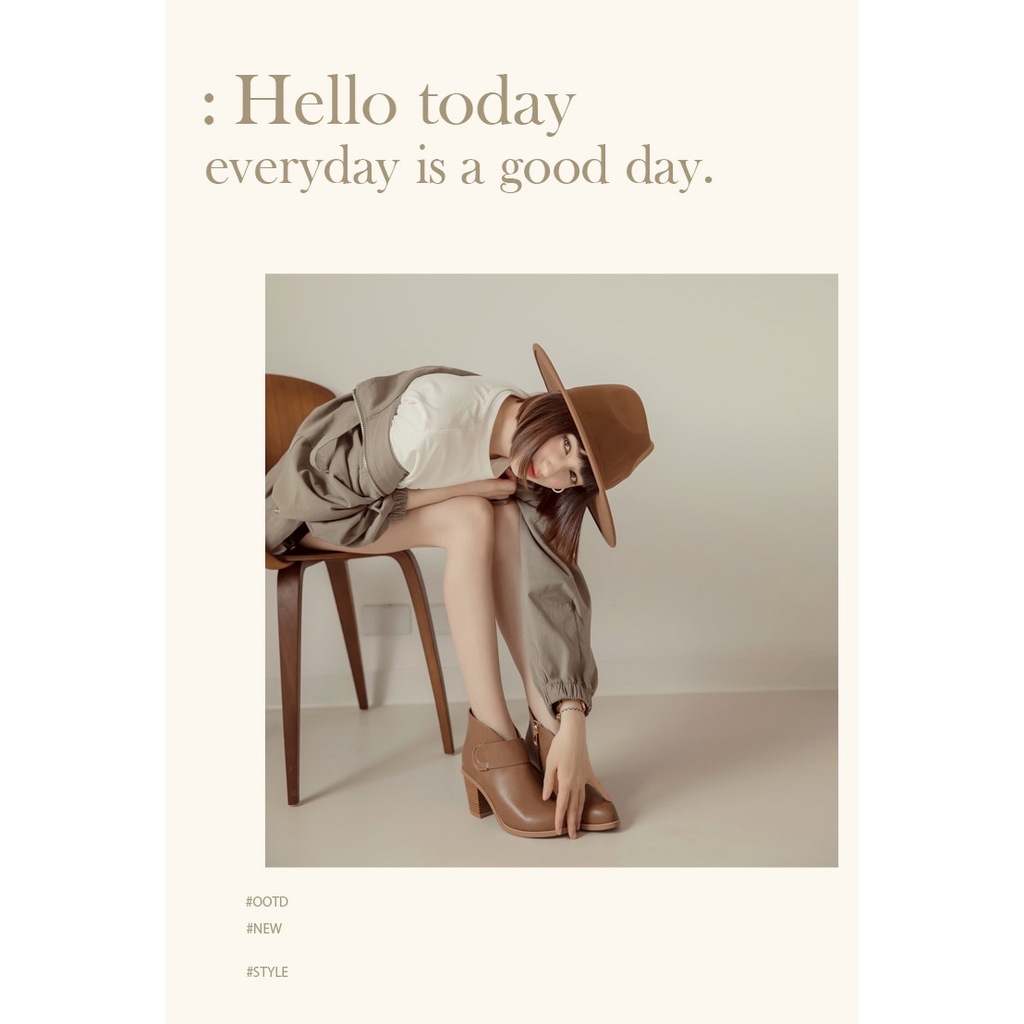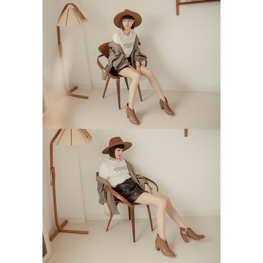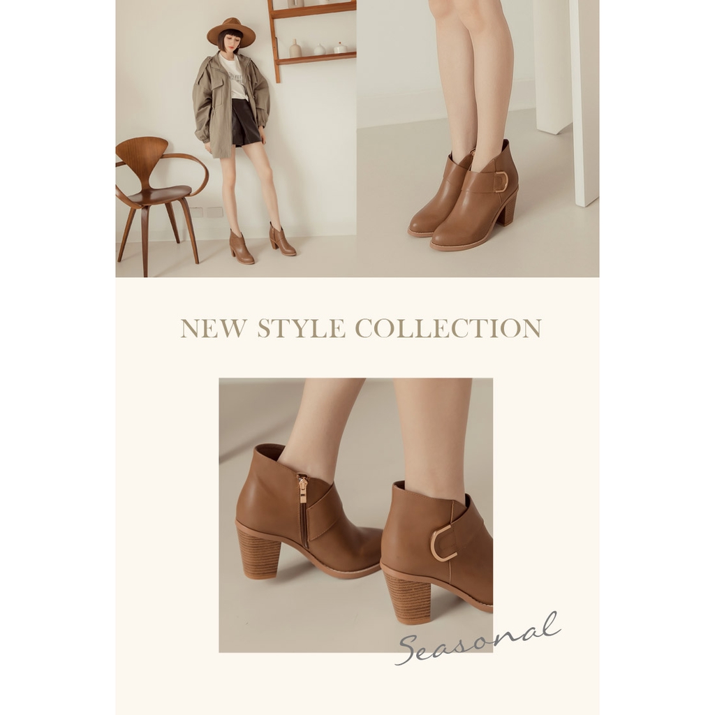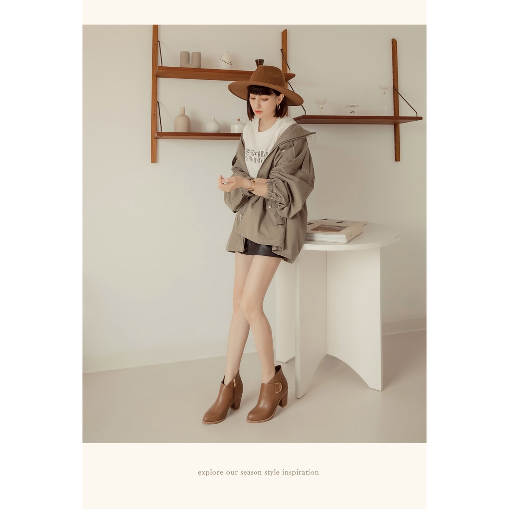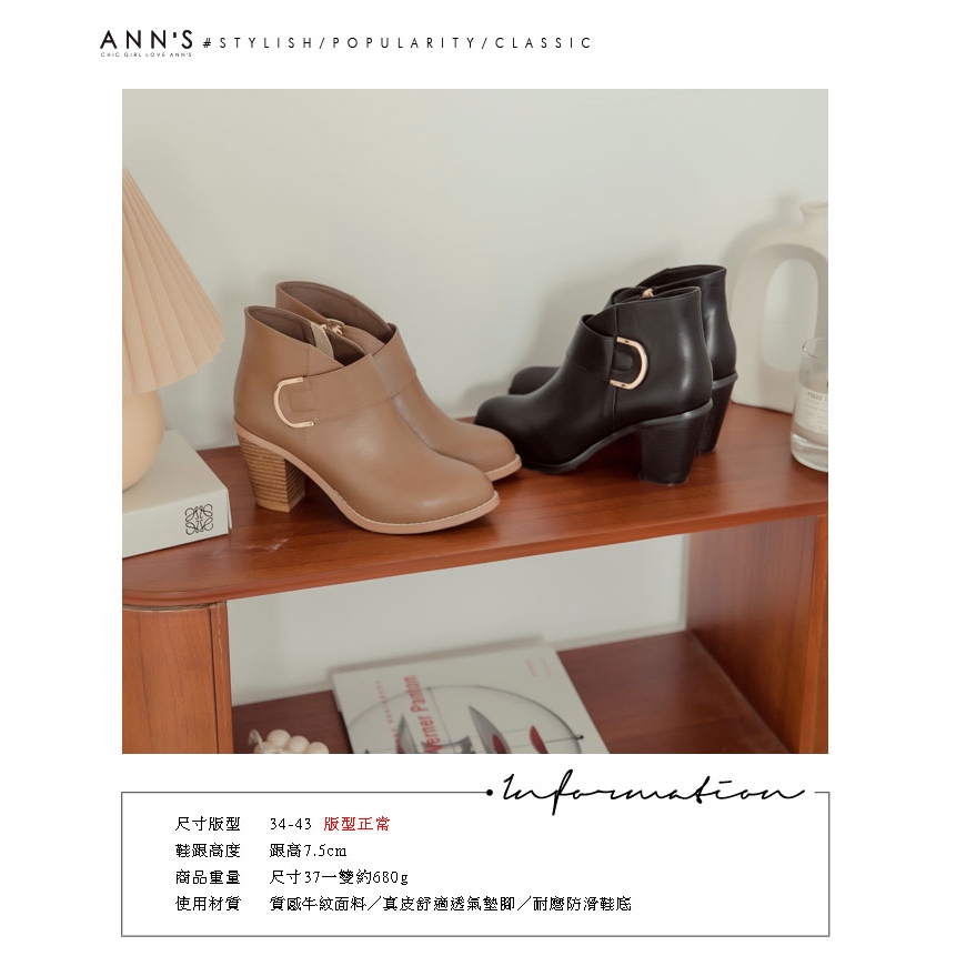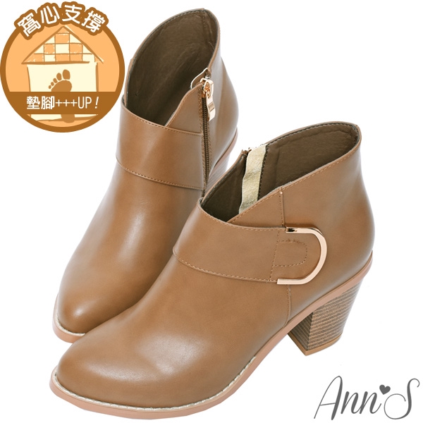 Ann’S瘦哦-視覺顯瘦V口金色圓弧扣尖頭粗跟短靴7.5cm-卡其