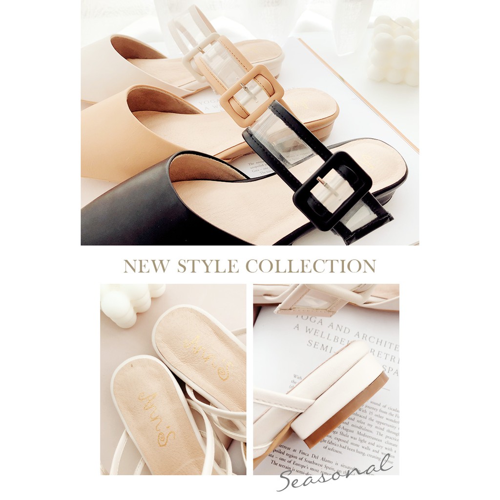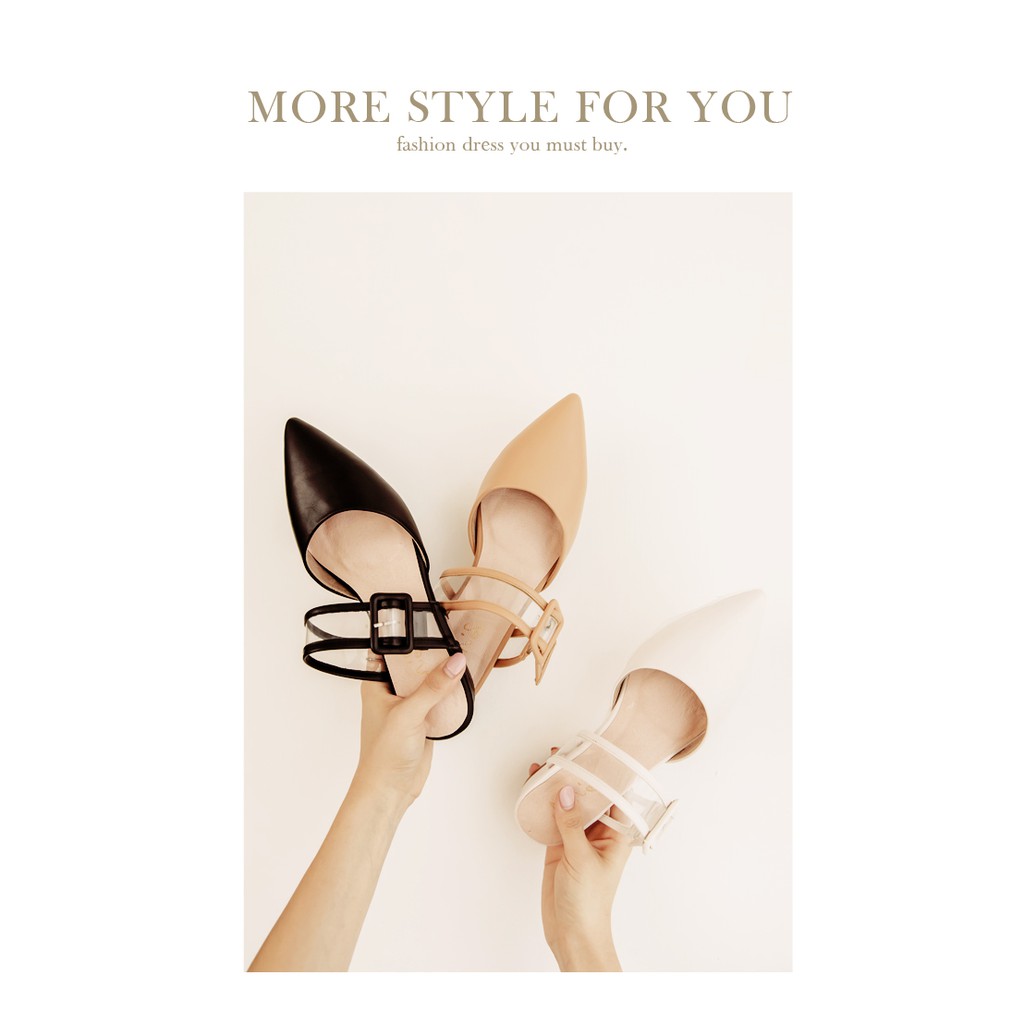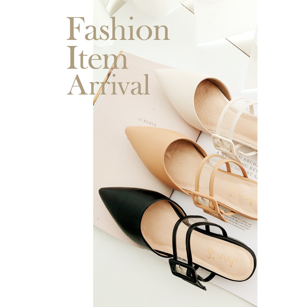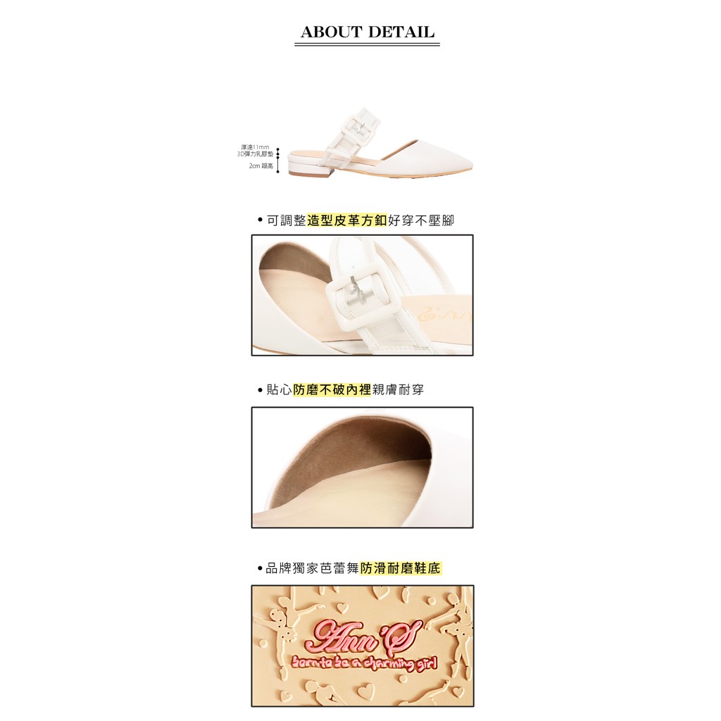 Ann’S方扣軟質透明寬帶尖頭穆勒粗跟鞋2cm-米白(版型偏小)