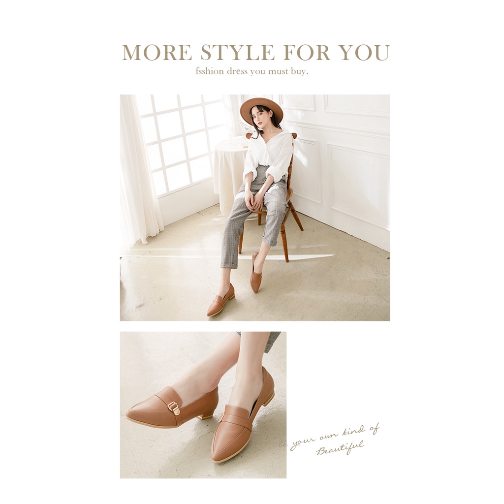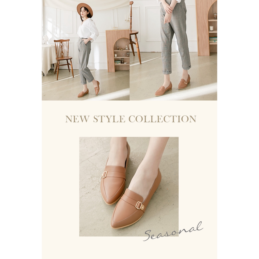 Ann’S綿羊皮真皮金釦加寬楦尖頭低跟樂福鞋-棕